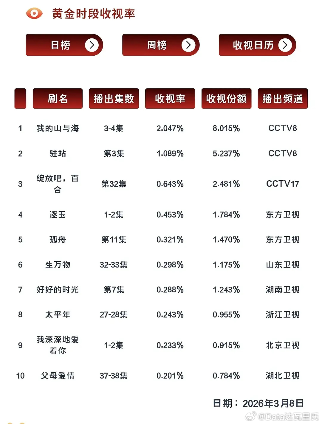 我的山与海收视率 酷云收视率5-6集2.1914%,1-6集均2.2107%酷云二连降,估计与周一有关CVB3-4集2.047%,1-4集均2.075%,2026央八第一