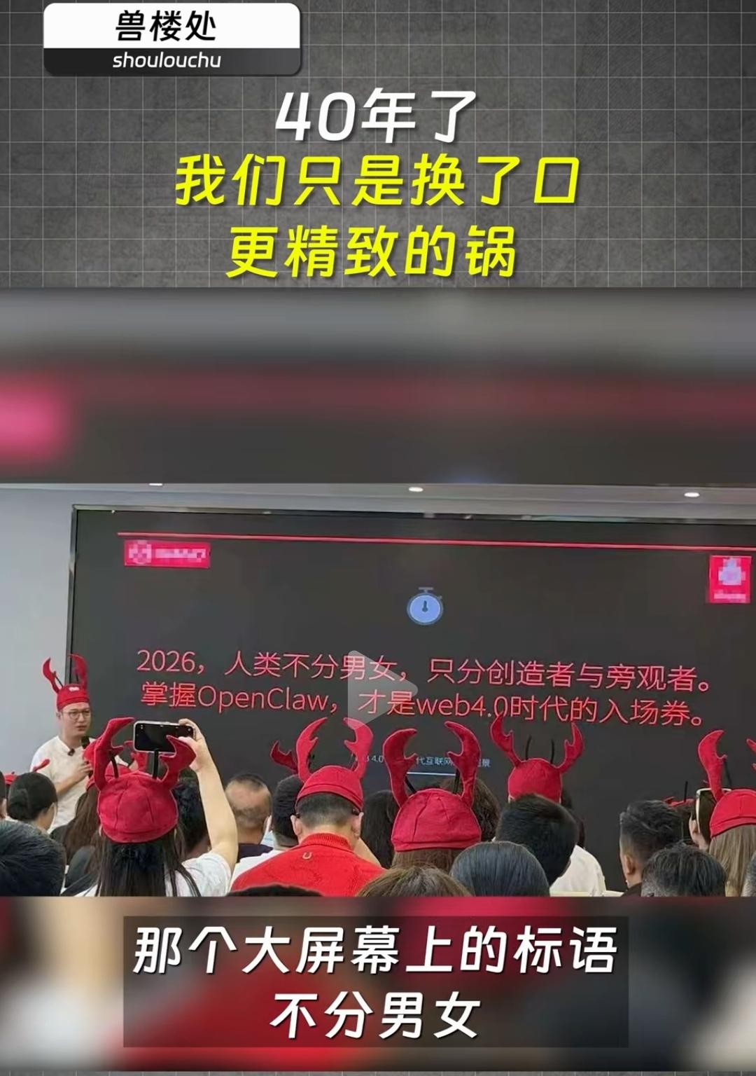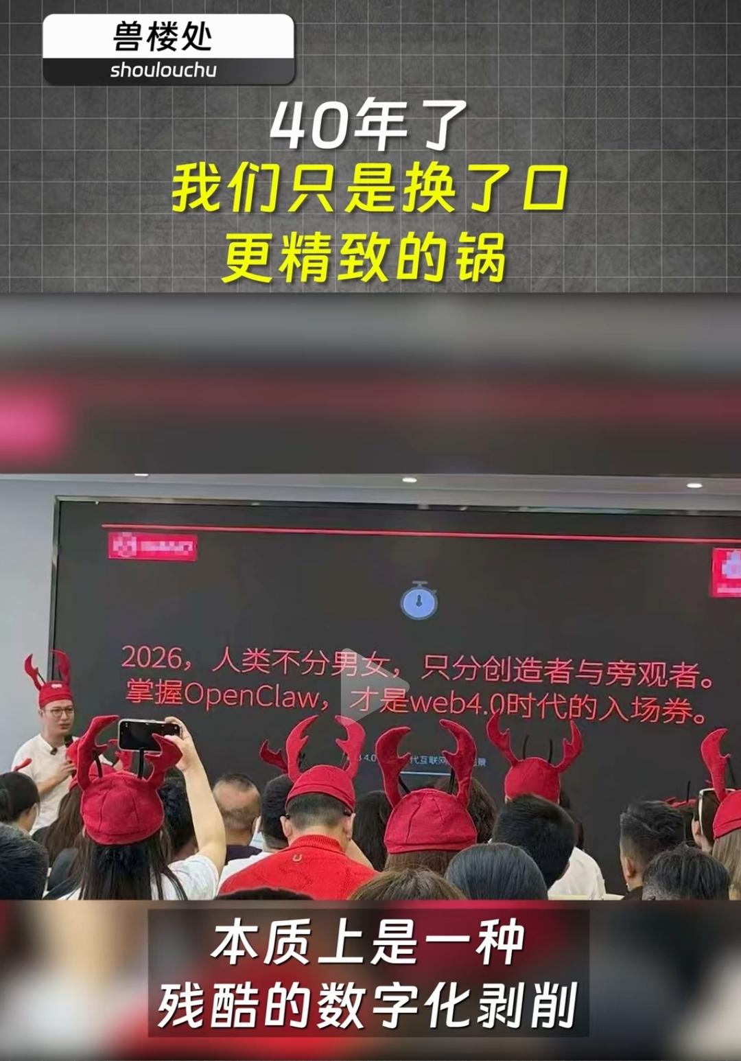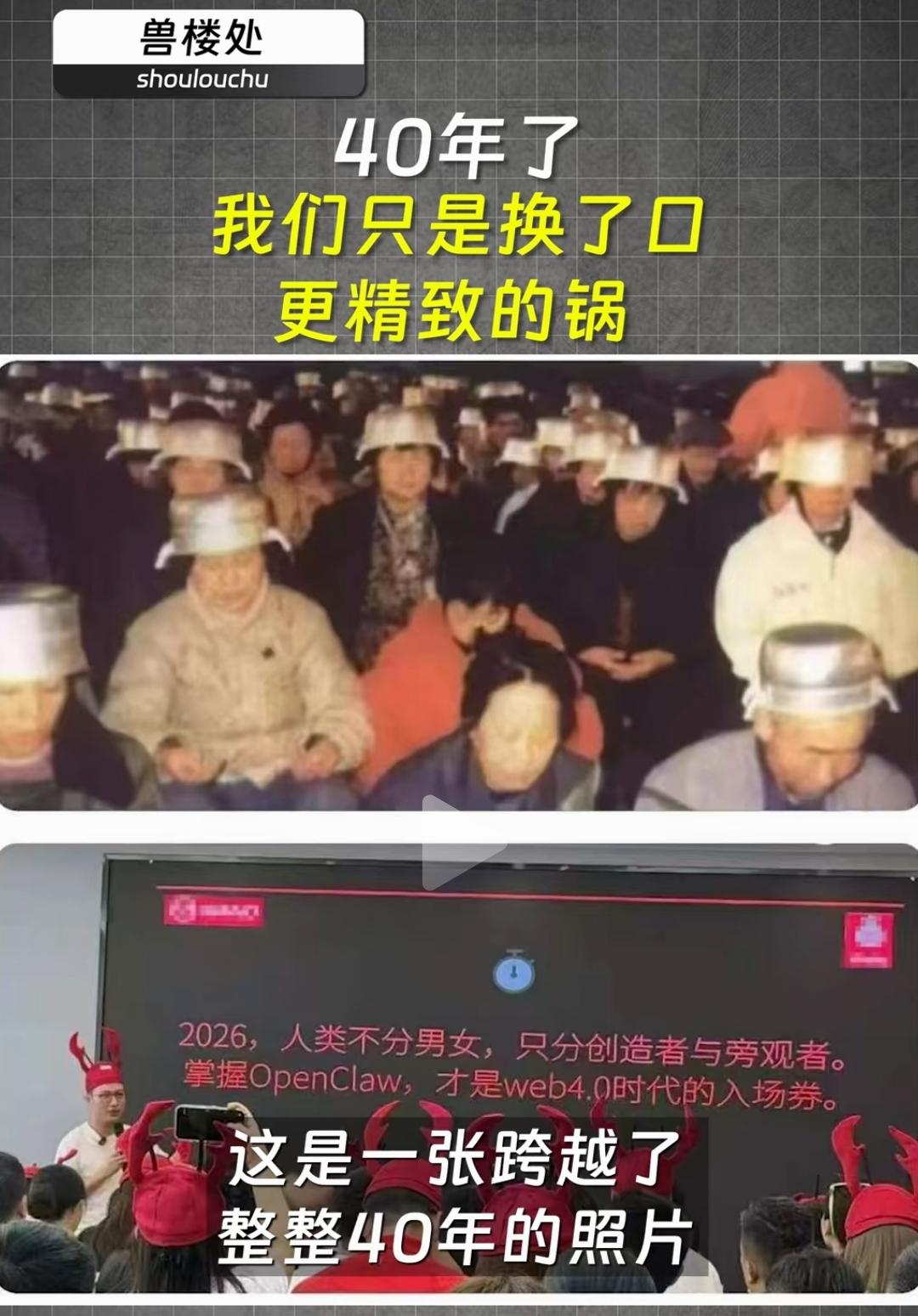 这句话真的具有超级洞察力。 40年了,我们只是换了一口更精致的锅。 你还别说龙虾🦞角和信息锅真的很配。 锅里装着菜,小龙虾本来就菜。 其实再往前推,五石散和仙丹也是这口锅,也是这个龙虾🦞角。 人类从未改变[笑哭][笑哭][笑哭][笑哭] 大家不要焦虑,卖小龙虾这个头套能赚钱。[偷笑] 点右上角关注我,我们一起去看这个魔幻的世界