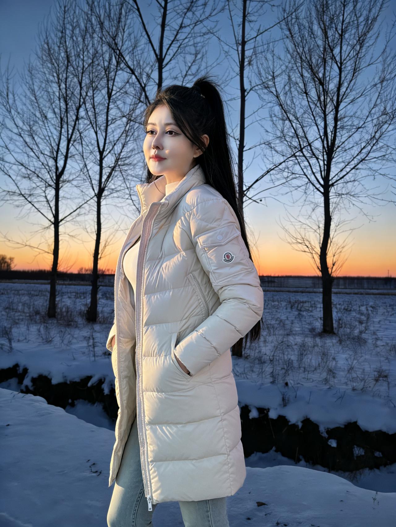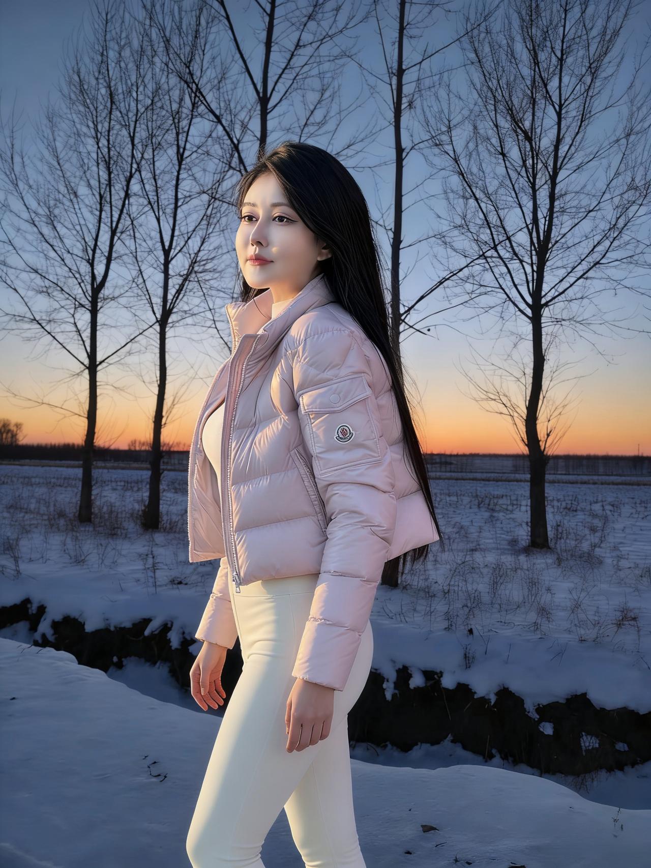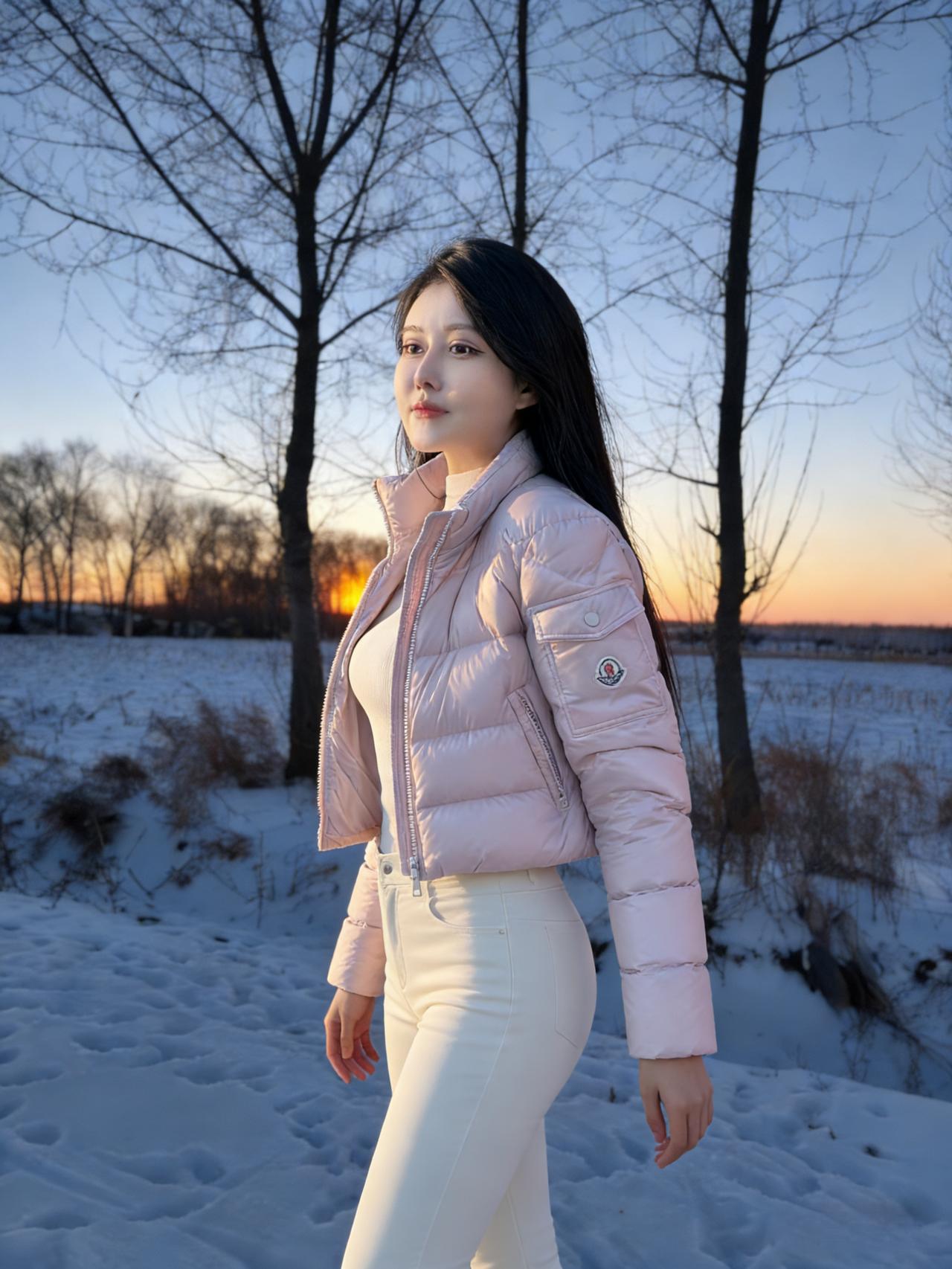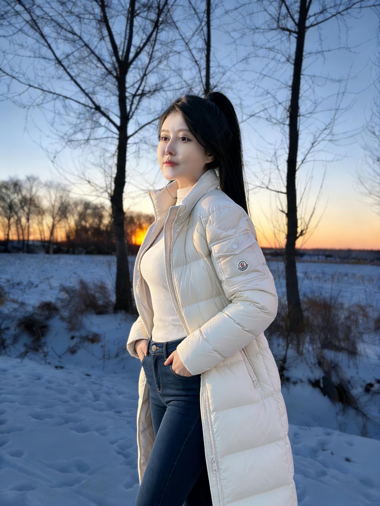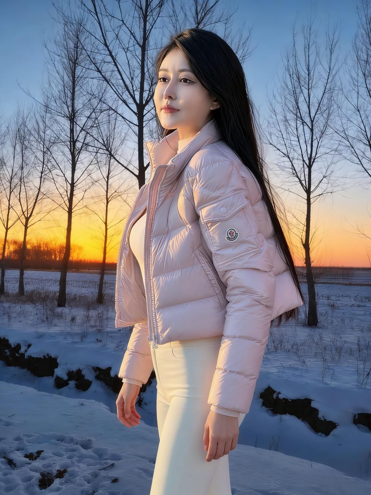 雪把大地揉成柔软的宣纸 树桠是蘸了墨的笔,斜斜划开暮色 白羽绒服垂落的褶皱 是未融的雪浪,兜住落日的余温 手插口袋的姿态,把寒风挡在门外 马尾辫扬起,像黑绸掠过雪野的风 ~ 粉色短款羽绒裹着轻俏 白裤踩着雪,踩出细碎的星光 长发垂落的弧度,吻过粉色的肩 落日在身后烧红了半边天,她是雪地里的一束蔷薇 ~ 脚步轻碾积雪的纹路 粉色羽绒的棱角,撞碎了薄暮的凉 树影在她身上叠出斑驳的诗行 目光望出去,越过雪野,抵着天边的橙红 ~ 米白中款羽绒裹着温柔 马尾又扬起,是少年气的风帆 浅牛仔裤陷进雪,像云落进湖面 指尖藏在口袋,攥着一捧暮色的温暖 ~ 粉色羽绒的边缘洇着霞彩 白裤的线条,是雪地里的白月光 长发漫过肩头,漫过暮色的褶皱 风掠过,掀动羽绒的蓬松,像掀动一朵云 ~ 粉色在雪色里漫开温柔 树影更浓了,把落日的光挤成细线 她站着,是雪野里未眠的花 目光里盛着的,是比落日更暖的远方 ~ 雪还在落,落在羽绒的纹路里 落在长发的末梢,落在白裤的褶皱里 每一个帧影,都是雪与暮色的私语 是她,把冬日的冷,揉成了温柔的形状 树桠还在写,写她站在雪野的诗 写粉色与白色,写长发与马尾 写落日吻过她的轮廓,写雪吻过她的衣几十行的字,装不下雪野里的她的美 装不下暮色里,那抹撞碎寒冬的温柔