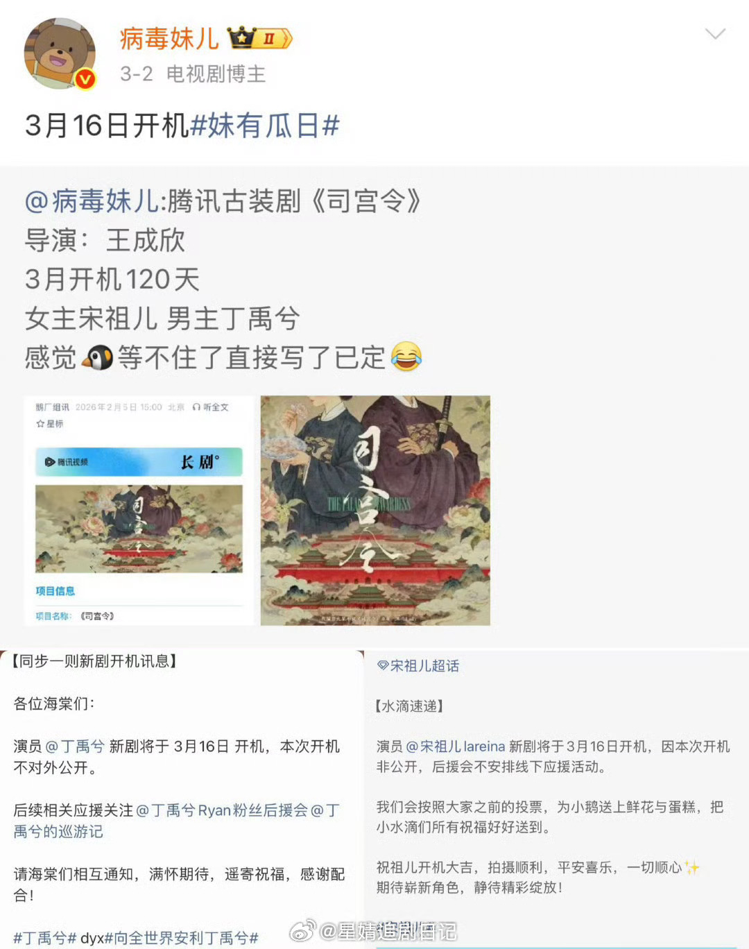 吃到🍉司宫令主演已定,丁禹兮、宋祖儿主演。 《司宫令》官博开通~从目前的爆料看,是小丁在前了!即将开机