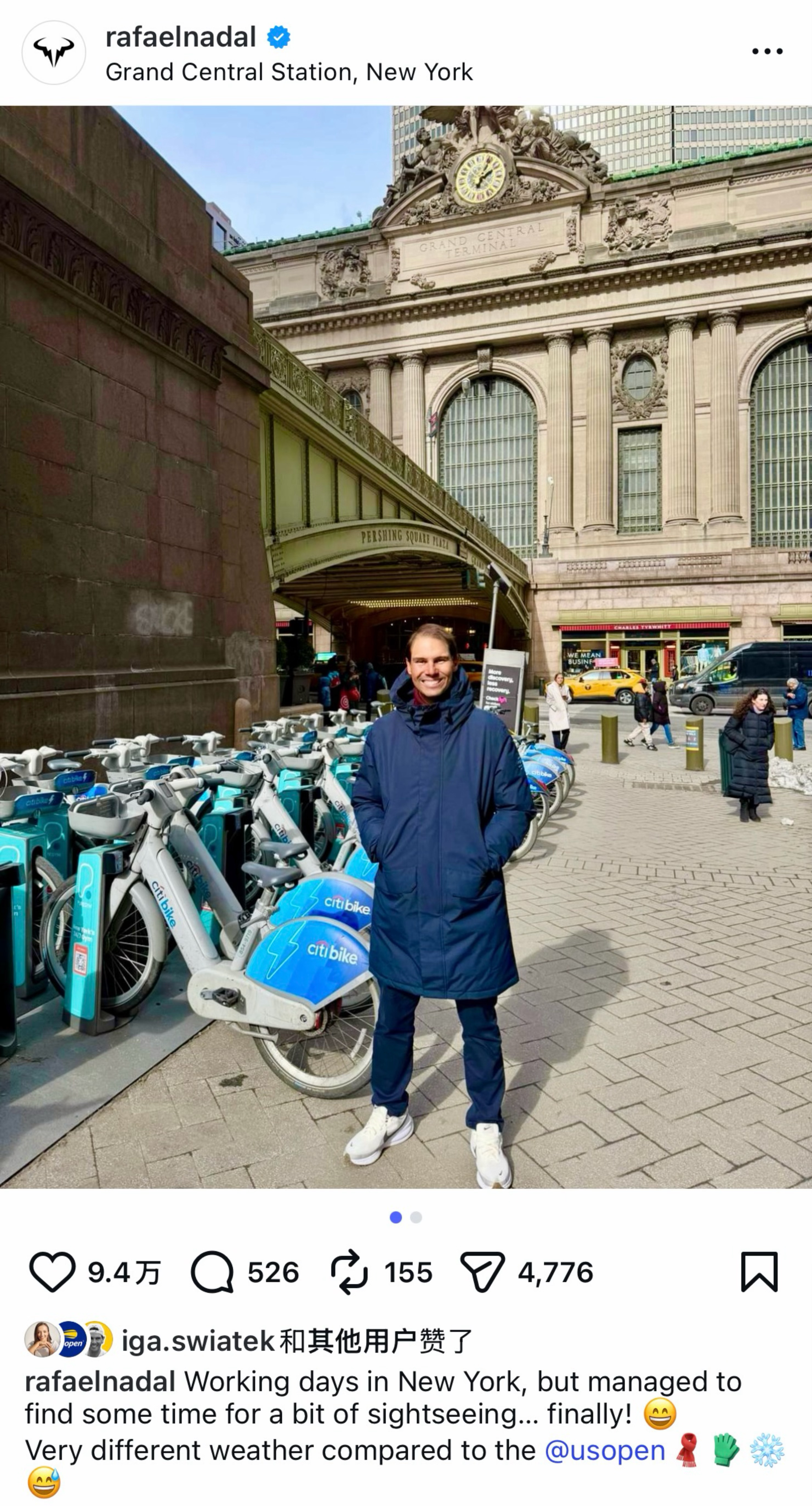 纳达尔在社交媒体分享上周在纽约的游客照,豆子说冬天纽约的天气和美网完全不一样,但他还是那个熟悉的假笑男孩😏Vamos Rafa