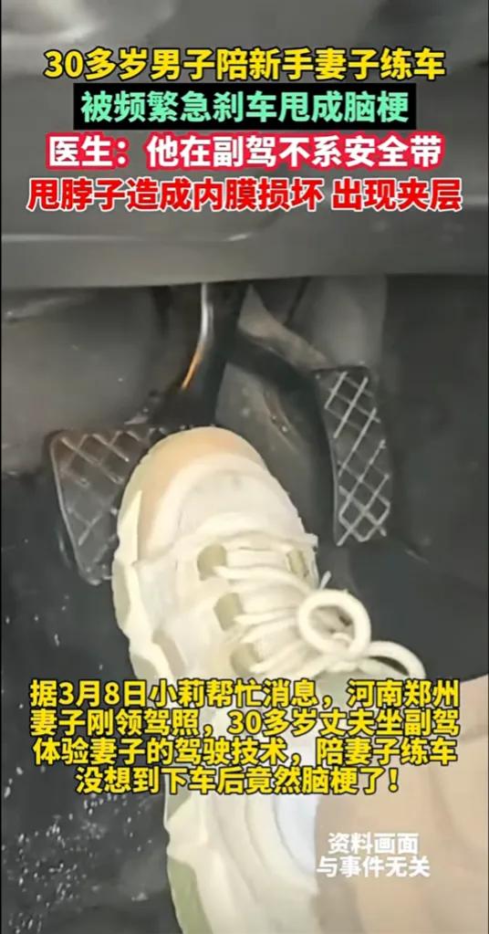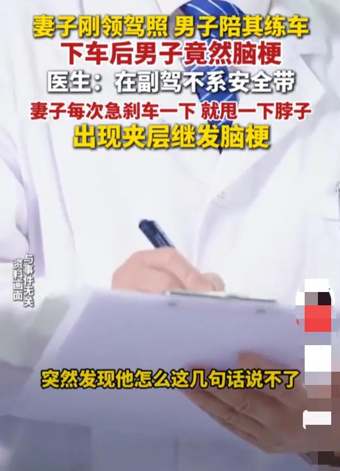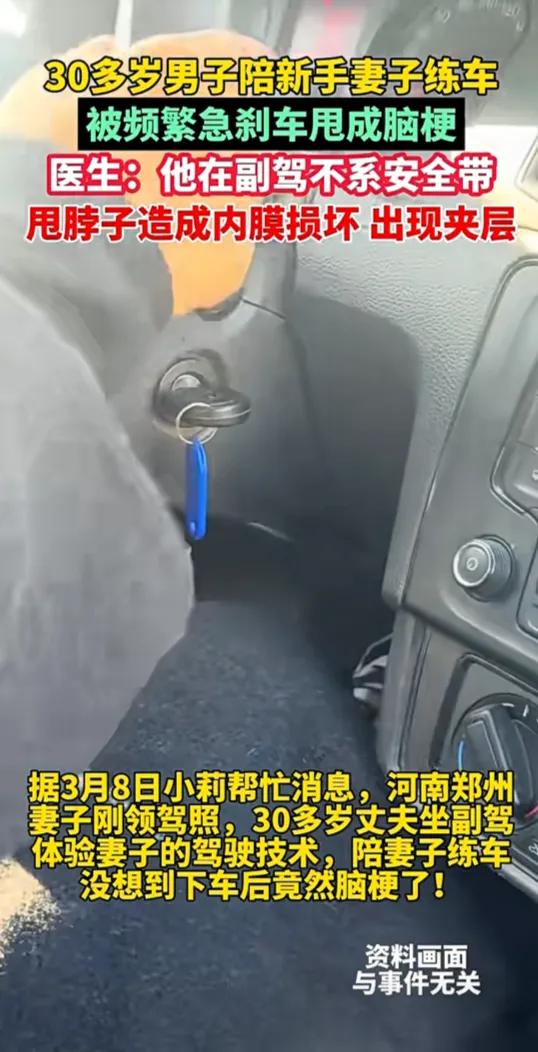 郑州,30岁男子陪妻子练车,结果甩成了脑梗。原来是男子没有系安全带,妻子每一次刹车,他的颈部都会前后左右甩动,导致血管内膜破损,夹层继发性脑梗。网友们说,这难道不是气的吗? 那天是妻子刚拿驾照的第三天,男子特意抽了上午的时间,带她去城郊车少的路段练手。妻子坐在驾驶座上攥着方向盘,指尖都在发抖,男子坐在副驾,嫌系安全带麻烦,还笑着拍她肩膀:“别怕,有我盯着,慢点开就行。” 车子刚开出去几公里,妻子就因为紧张,好几次看到路边行人就猛踩急刹车。第一次急刹时,男子整个人往前扑,脑袋差点磕到中控,脖子猛地往前甩又狠狠弹回来,他揉着后颈骂了句“你慢点儿!”,却还是没想起要系上安全带。 接下来的四十多分钟里,这样的急刹反复了七八次。妻子对车距判断不准,遇到路口就下意识踩死刹车,男子没了安全带的束缚,每次都跟着惯性前扑后晃,脖子像个没固定的钟摆,一次次被剧烈拉扯。他一开始还能吐槽几句,到后来只觉得脖子发僵,后脑勺隐隐发胀,却只当是坐得太久累了,没往心里去。 次日他回公司上班,刚进办公室坐下,就觉得半边胳膊发麻,拿起水杯都握不住。同事跟他搭话,他张了张嘴,却发现自己连完整的句子都说不出来,嘴角还不受控制地往一边歪。他感觉不对劲,即刻就医。 送到医院一查,才知道是颈部血管内膜被反复甩动扯破,形成了动脉夹层,血块堵住了脑血管,诱发了急性脑梗。医生拿着片子跟家属说,这种情况很隐蔽,刚开始只是脖子酸痛,等出现说话不清、肢体麻木时,血管已经堵得很严重了。 男子不是被气病的,是被自己的侥幸和疏忽害了。他以为副驾不用系安全带,以为新手练车不会出大事,却没想到,一次次不起眼的甩动,最终攒成了足以摧毁生活的重病。 这件事也给所有坐副驾的人敲了警钟:安全带从来不是给司机一个人系的,每一次急刹、每一次颠簸,都可能成为伤害你的导火索。别等意外发生了,才后悔当初没多做那一个简单的动作。 各位读者你们怎么看?欢迎在评论区讨论。