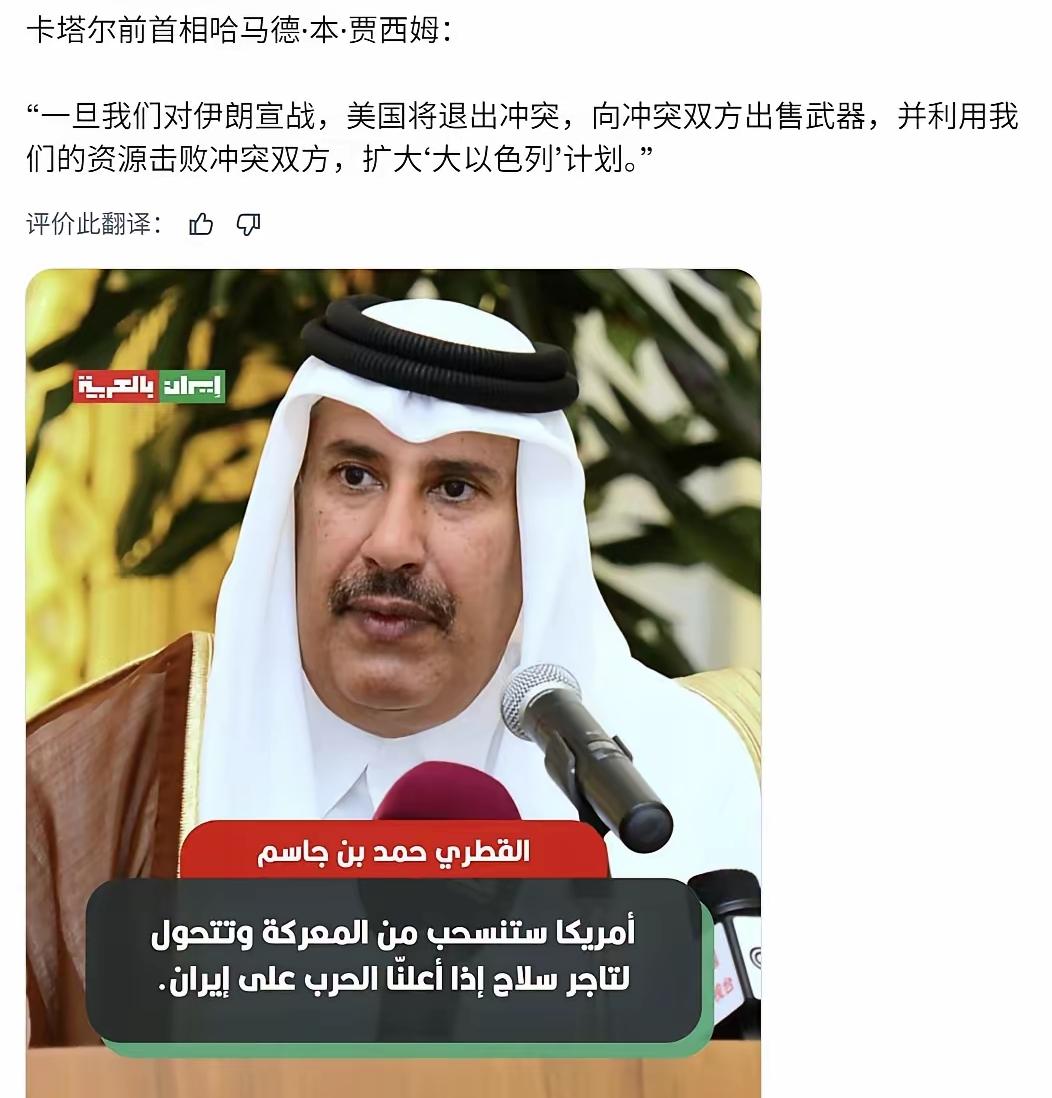 我点评一下:美国从来不是谁的保镖,它只做稳赚不赔的生意。 卡塔尔前首相这番话,直接戳破了美国在中东的真实套路。别以为交了天价保护费,关键时刻就有人撑腰,真打起来,美国跑得比谁都快,转身就变成最大军火商,两边卖武器赚得盆满钵满。 它最擅长的就是挑动对立、消耗资源,让中东国家互相消耗,自己坐收渔利,一步步推进它的地区布局。所谓的安全承诺,不过是用来拴住盟友的绳子,真到风险时刻,盟友只是它棋盘上的棋子。 现在越来越多中东国家看清这一点,不再盲目跟风,而是选择自保与中立。靠人不如靠己,把命运握在自己手里,才是最靠谱的出路。 你觉得,中东国家还会继续相信美国的“安全承诺”吗?