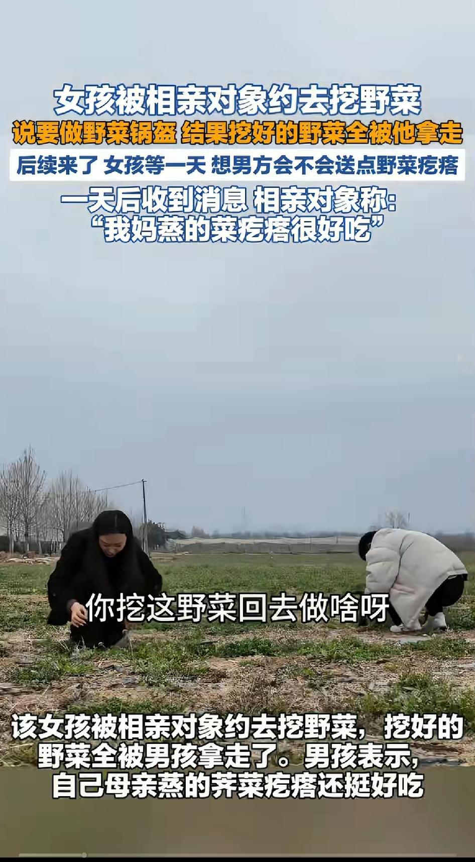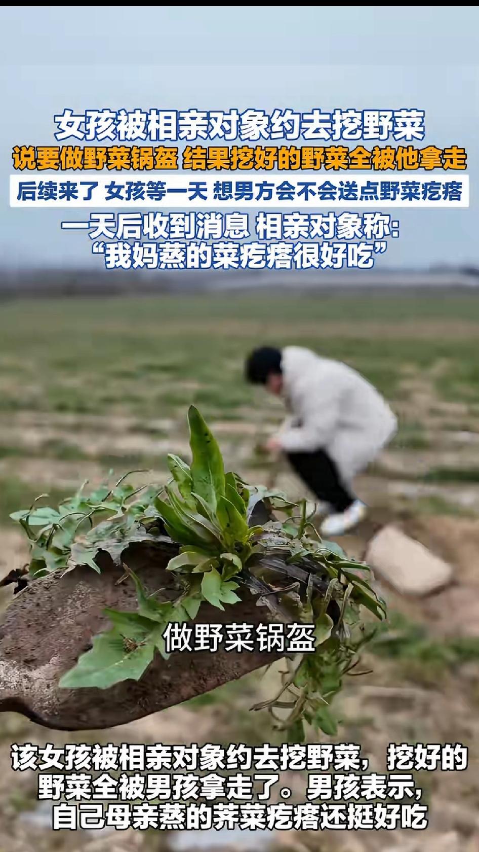 女孩被相亲对象约去挖野菜,说要做野菜锅盔,结果挖好的野菜被男子全部带走,没给女儿