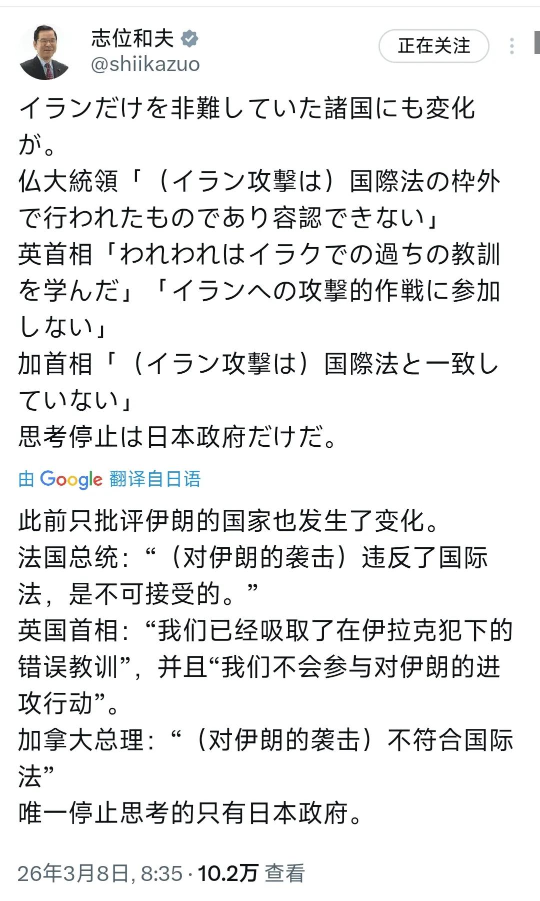 据日本共产党委员会长志位和夫3月8日发文写道:“此前只批评伊朗的也发生了变化。法国总统:“(对伊朗袭击)违反国际法,是不可接受的”。英国首相:“我们已吸取了在伊拉克犯下的错误的教训,并且我们不会参与对伊朗的进攻行动”。加拿大总理:“(对伊朗袭击)不符合国际法”。唯一停止思考的只有日本。” 显然,日本共产党委会长志位和夫这一论言是对日本高市政府不敢坚守国际公平正义,表达出非常不满的批评态度。 其实,在对美以对伊朗军事打击问题上,日本与西方其他国家态度不一样极有可能都是为自己的政治利益考虑的。 当前日本执行内外政策主要还是依附于美国的支持进行,特别日本可能要突破《和平宪法》解禁武器出口及自卫队的相关限制等,这都需要特朗普政府的支持,因此不敢得罪美国。而加拿大及其它欧洲国家同样出于自身利益,态度才发生变化反对美以对伊朗的非法军事袭击。因为从委内瑞拉到伊朗美国都是无视国际法,并且未获得联合国安理会授权而进行的非法军事行动。别忘记了特朗普曾宣称要把加拿大变成美国第51个州,还威胁要抢夺欧洲国家丹麦的格陵兰岛,如果美国惯用非法手段又在伊朗得逞,那么下一步没人敢保证不是格陵兰岛或者加拿大!这或许是其它西方国家与日本在对待美国在伊朗问题上态度不同的根本原因之一吧!