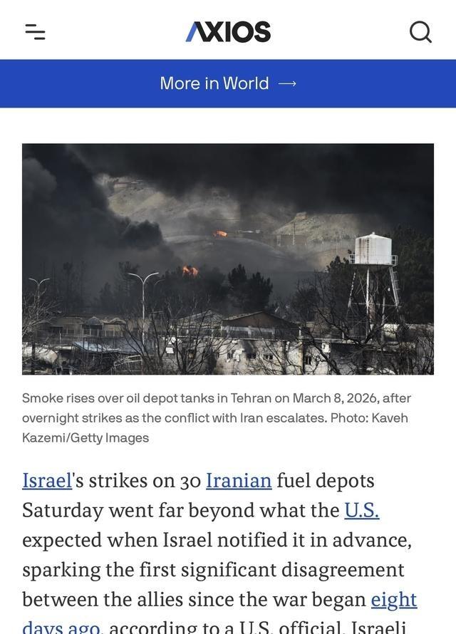 3月8号,美国媒体AXIOS爆了个大料:以色列前一天晚上对伊朗30个燃料库发动的袭击,远远超出了美国的预期,引发了开战以来两国之间的“首次重大分歧” 。这话啥意思?翻译成大白话就是:小弟下手太狠,把大哥给惹毛了。 以色列空军在3月7日晚对伊朗首都德黑兰及其周边厄尔布尔士省的30座燃料储存设施实施大规模空袭,这次行动直接导致美以关系出现开战以来最明显裂痕。美国媒体Axios在3月8日独家报道指出,以色列事先确实通知了美方,但实际打击规模和范围远远超出华盛顿的预期,美方高层对此表达强烈不满,甚至用直白的三个字母表达震惊。这次袭击不只是军事层面的动作,更把能源价格和盟友协调问题推到台面,暴露了美以在战略目标上的分歧。 以色列方面把这些燃料库定义为合法军事目标。国防军声明说,这些设施被伊朗政权用来向包括军事部门在内的各类用户供应燃料,空袭目的是削弱伊朗后勤补给能力,同时警告伊朗不要继续针对以色列民用目标动手。以色列军方官员补充,这次行动传递明确信号,旨在让伊朗感受到压力。伊朗官方统计显示,袭击造成至少4名油罐车司机死亡,次日德黑兰部分地区出现酸性黑雨,对环境和民众健康产生影响。伊朗外交部发言人公开谴责这是蓄意化学攻击,释放有害物质,威胁平民生命和生态环境。 美国反应截然不同。Axios援引多名消息人士报道,美方对打击广度感到惊讶。一位美国高级官员直言不认为这是好主意,另一位官员表示对规模之大超出预期。以色列官员透露,美方事后传来的信息非常直接,就三个字母表达困惑和不满。特朗普身边顾问透露,总统对烧掉石油资源不满,因为这会直接推高油价,影响美国国内民生和政治议程。袭击当天国际油价快速上涨,纽约原油期货一度接近每桶120美元,创下2022年以来高点。高盛分析认为,如果冲突持续,油价可能进一步推向147美元历史高位。特朗普政府面临中期选举压力,高油价直接冲击选民情绪,通胀问题难以平息。 更深层的问题在于战略判断差异。美国担心袭击民用相关基础设施反而会适得其反。官员分析指出,针对普通民众依赖的能源设施动手,可能促使伊朗社会更团结支持现政权,而不是像华盛顿希望的那样出现内部不满和变革压力。美国长期对伊朗的政策思路偏向通过经济压力和内部动荡推动政权更迭,以色列这次行动等于帮了倒忙,把外部打击转化成内部凝聚力。参议员林赛·格雷厄姆作为特朗普亲密盟友,也公开呼吁以色列在选择目标时保持谨慎。他承认以色列在削弱伊朗能力上表现突出,但强调石油经济对伊朗民众未来生活至关重要,过度破坏不利于长远目标。 以色列总理内塔尼亚胡领导的政府一贯对伊朗采取强硬路线。他长期视伊朗为首要威胁,推动空军远程打击能力建设,并在国际场合反复强调阻止伊朗军事扩张的必要性。这次行动符合以色列一贯逻辑:先发制人、切断对手后勤、制造威慑。但在美国看来,这种打法忽略了全球能源稳定和盟友国内政治现实。美以打了多年配合,这次头一回因为目标选择和后果评估闹出这么大分歧。 美以分歧的核心其实很简单:以色列想尽快打疼伊朗、瓦解其军事能力,美国则更在意控制油价、避免国内政治代价、维持长远战略布局。盟友之间两本账撞到一起,短期内协调难度加大,后续怎么走还得看双方怎么谈。