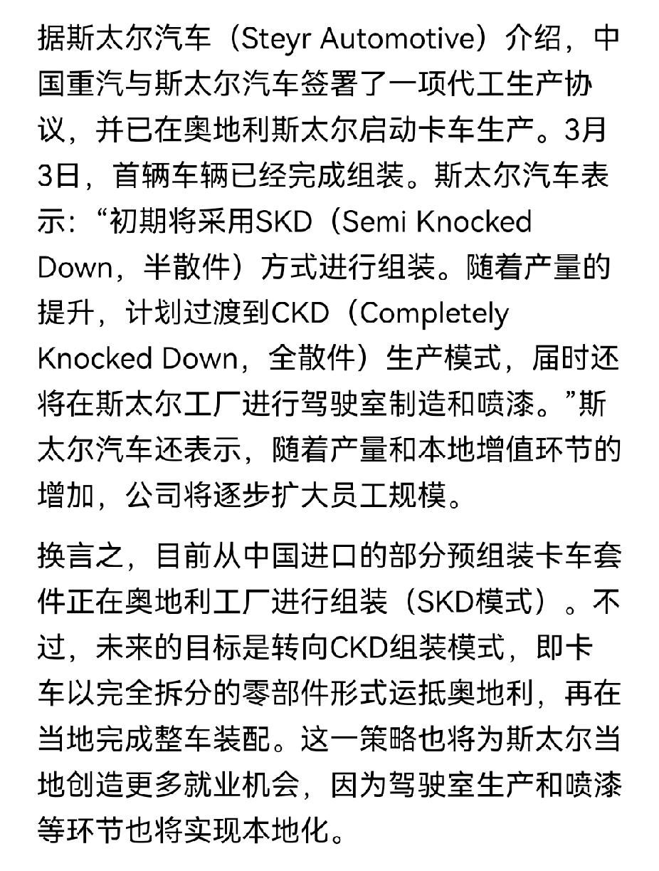 斯太尔竟然给重汽代工了。真是恍若隔世,30年前重汽还得学斯太尔的技术呢。 斯太尔是奥地利的卡车企业。当年斯太尔向中国转让技术,竟然诞生了四个重卡领域的企业:中国重汽、陕西重卡、重庆红岩、潍柴动力。 然而,时过境迁,轮到重汽反向斯太尔输出技术了。 奥地利是欧洲国家,选择在奥地利组装可以避开欧盟的高额关税。 初期是从中国进口重汽卡车的预装套件,在奥地利完成总装;后期将会转为进口零部件,在奥地利进行组装,然后奥地利方面实现汽车驾驶室等零部件的国产化。 这不就是我们当年走的路吗,现在反过来了。中国重汽当年学习斯太尔的技术,现在反过来要向斯太尔输出技术了。