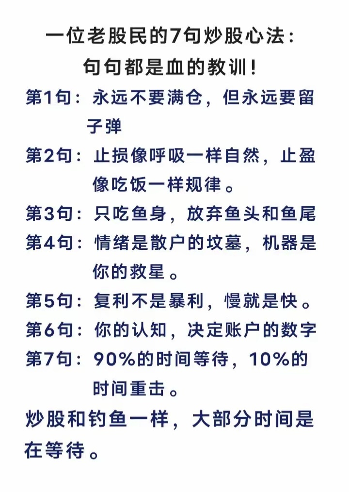 老股民的7句炒股心法,字字扎心,句句保命在股市里,真正的高手从不是靠运气,而是靠刻在骨子里的生存智慧。这7句心法,是无数次血的教训换来的,看懂了,少走十年弯路。1️⃣ 永远不要满仓,但永远要留子弹满仓=把命交给市场,留子弹=给自己留后路。行情好时不贪,行情差时不慌,仓位管理是保命的第一道防线。2️⃣ 止损像呼吸一样自然,止盈像吃饭一样规律不止损,越套越深;不止盈,利润归零。把“割肉”和“落袋为安”变成肌肉记忆,才能在波动中稳住阵脚。3️⃣ 只吃鱼身,放弃鱼头和鱼尾最诱人的鱼头鱼尾,往往藏着最大的陷阱。专注于趋势明确的“鱼身”,放弃博弈,才能稳稳抓住最丰厚的利润。4️⃣ 情绪是散户的坟墓,机器是你的救星贪婪追涨、恐惧割肉,都是情绪失控的代价。用交易系统代替直觉,用规则过滤噪音,才能在混乱中保持清醒。5️⃣ 复利不是暴利,慢就是快别幻想一夜暴富,复利的魔力在于“稳”。每年20%的收益,坚持十年,就是惊人的财富。慢下来,才能走得更远。6️⃣ 你的认知,决定账户的数字股市是认知的变现场。你赚的每一分钱,都是对市场理解的兑现;亏的每一分钱,都是认知的缺陷。持续学习,才是穿越牛熊的底气。7️⃣ 90%的时间等待,10%的时间重击炒股和钓鱼一样,大部分时间都是在等待。耐得住寂寞,才能在机会真正来临时,果断出手,一击制胜。这7句话,不是暴富秘籍,而是在市场里活下去的生存法则。收藏起来,每次交易前读一遍,少踩无数坑。