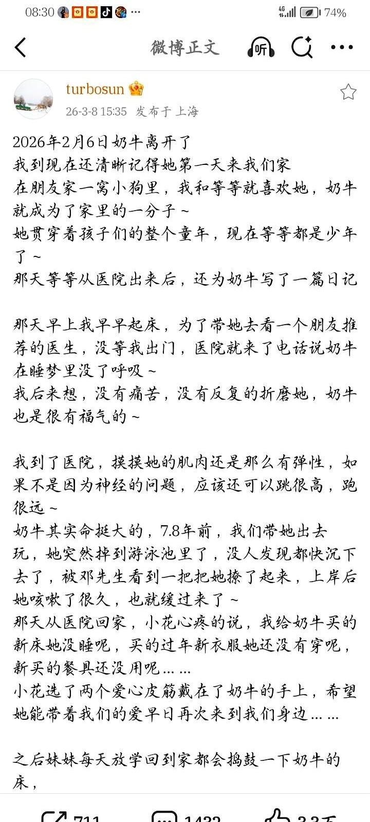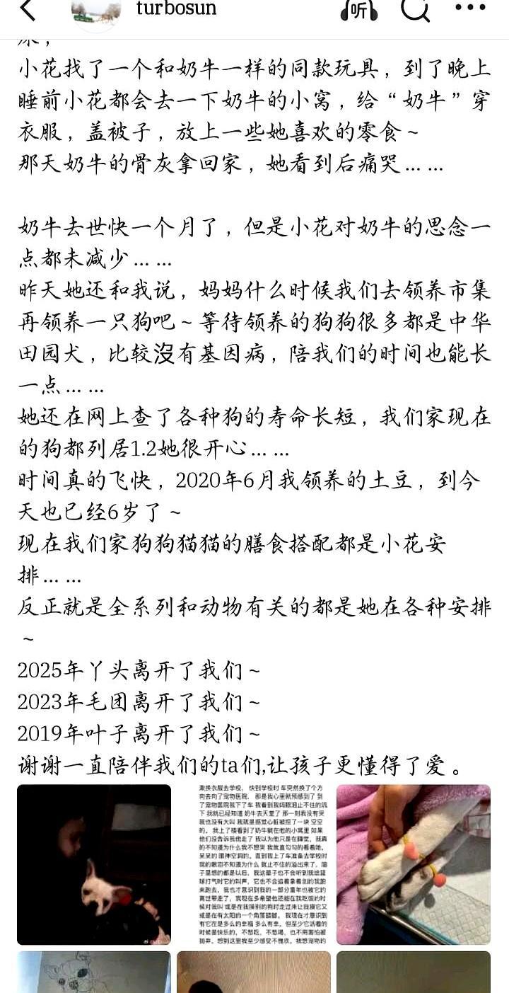 陪了你14年的家人突然走了,你得缓多久? 孙俪3月8号发的长文看哭了好多人。 家里养了14年的狗奶牛,上个月在睡梦里安安静静走的,没遭一点罪。 12年它刚到家的时候,还是和儿子等等一起挑的。 看着等等从蹒跚学步长到半大少年,女儿小花的整个童年,全是它晃尾巴的影子。 前几年它掉水里,还是邓超眼疾手快捞回来的,多陪了全家好几年。 走的时候小花提前买的新床新衣服都没来得及用,她把两个粉色爱心皮筋系在它爪子上,现在放学回家还会整理它的空床。 好多人说养宠物就是提前攒悲伤,可你看这俩孩子,早早就懂了怎么认认真真去爱,怎么好好面对告别。 现在小花还主动提要领养中华田园犬,把这份陪伴接着续下去。 哪是我们养宠物啊,是它们借十几年的时间,来教我们怎么好好爱人。