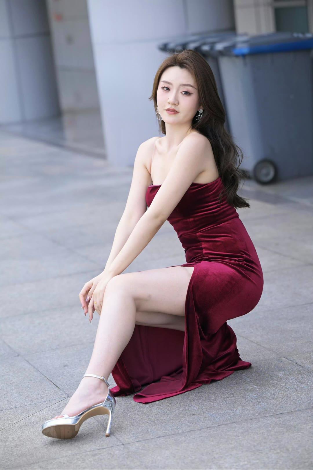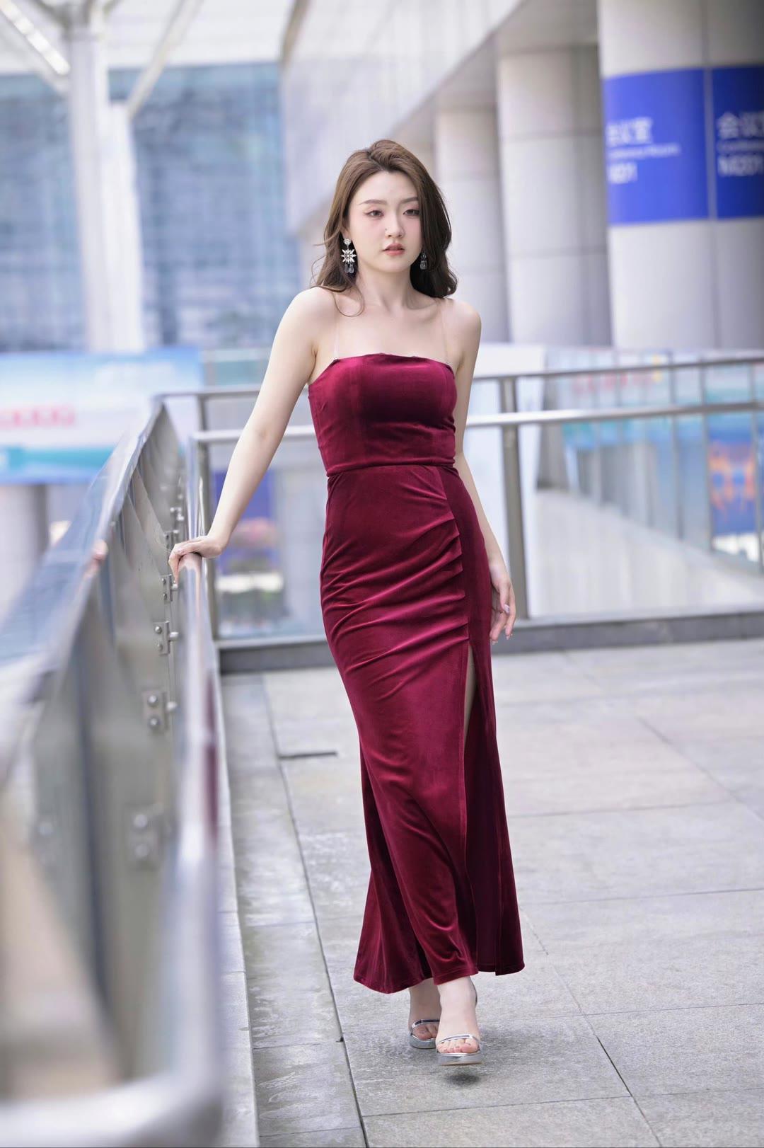 一身酒红丝绒开叉裙的穿着,尽显温柔与从容。