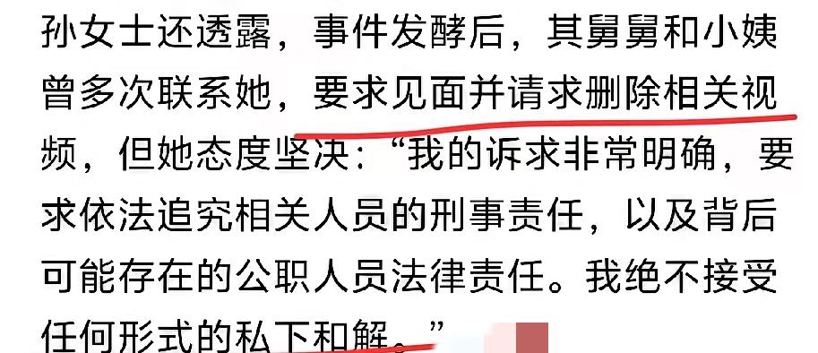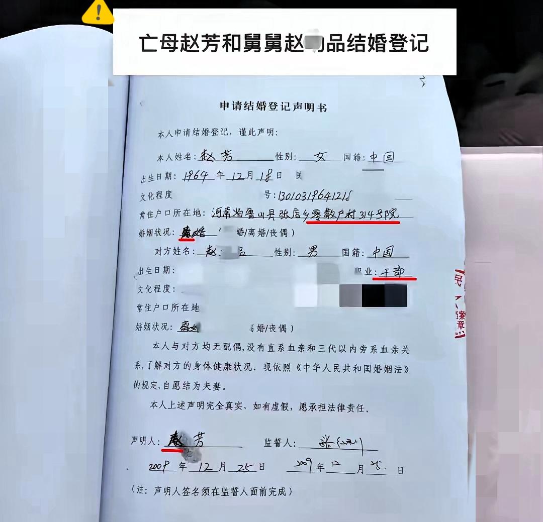 拒绝私了。“亡母去世被结婚”当事人孙艺菲说,小姨和舅舅私底下已经联系她了。想要见面,并要求她删所有视频。看来远在河南鲁山县老家的姐弟俩慌了。吞并了姐姐赵芳的遗产,吃外甥女的绝户。不让外甥女见自己亲生父亲。 母亲病重时不送大医院,草草放弃治疗;去世后伪造手续卖房迁户,甚至让逝者和亲弟弟登记结婚,只为霸占全部家产,还不让孩子见亲生父亲,桩桩件件都在践踏亲情与底线。 现在想靠私了息事宁人,根本没门!孙艺菲要的从不是妥协,而是迟到十几年的公道。亲情一旦沾上贪婪,比陌生人更可怕,这起事件也在提醒所有人,面对不公,只有硬刚到底,才能守住尊严与真相