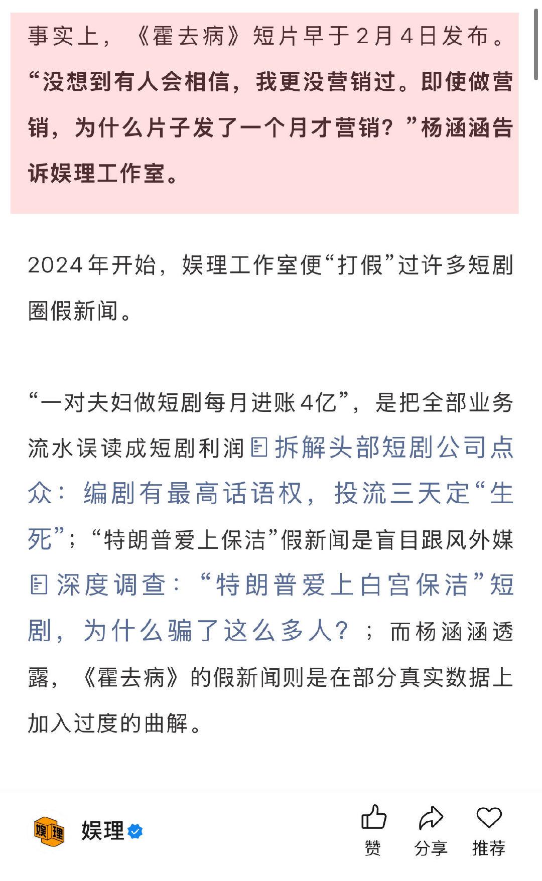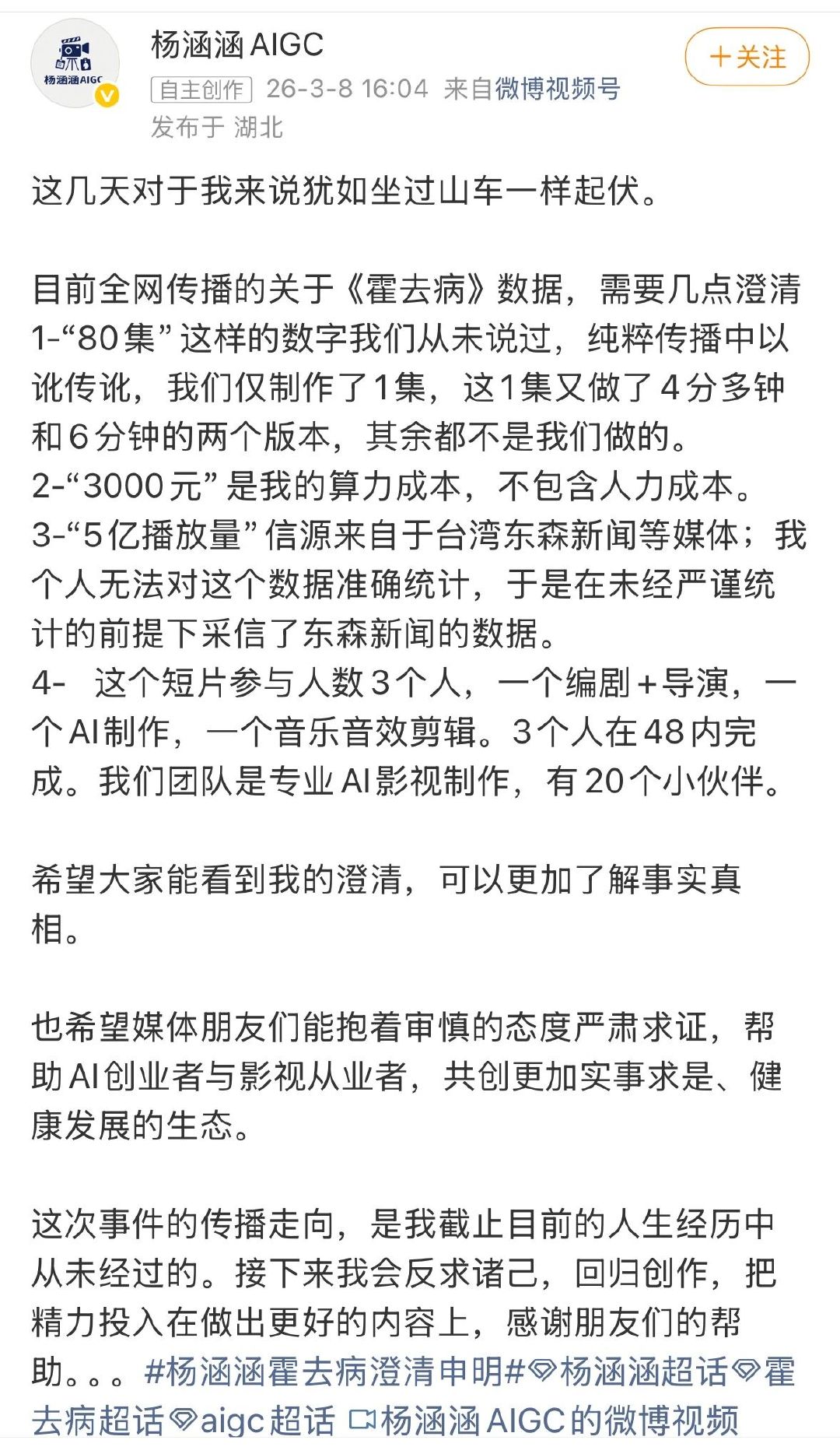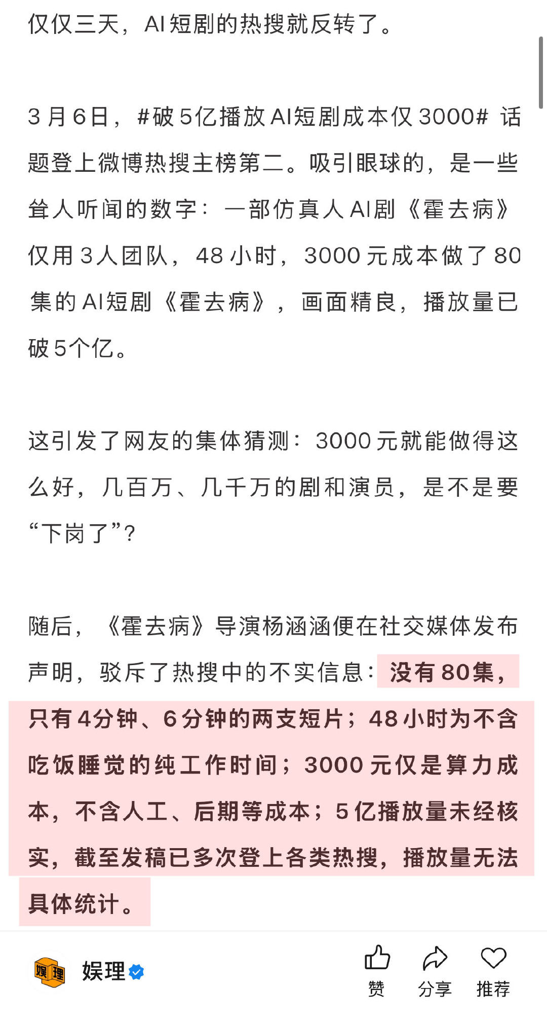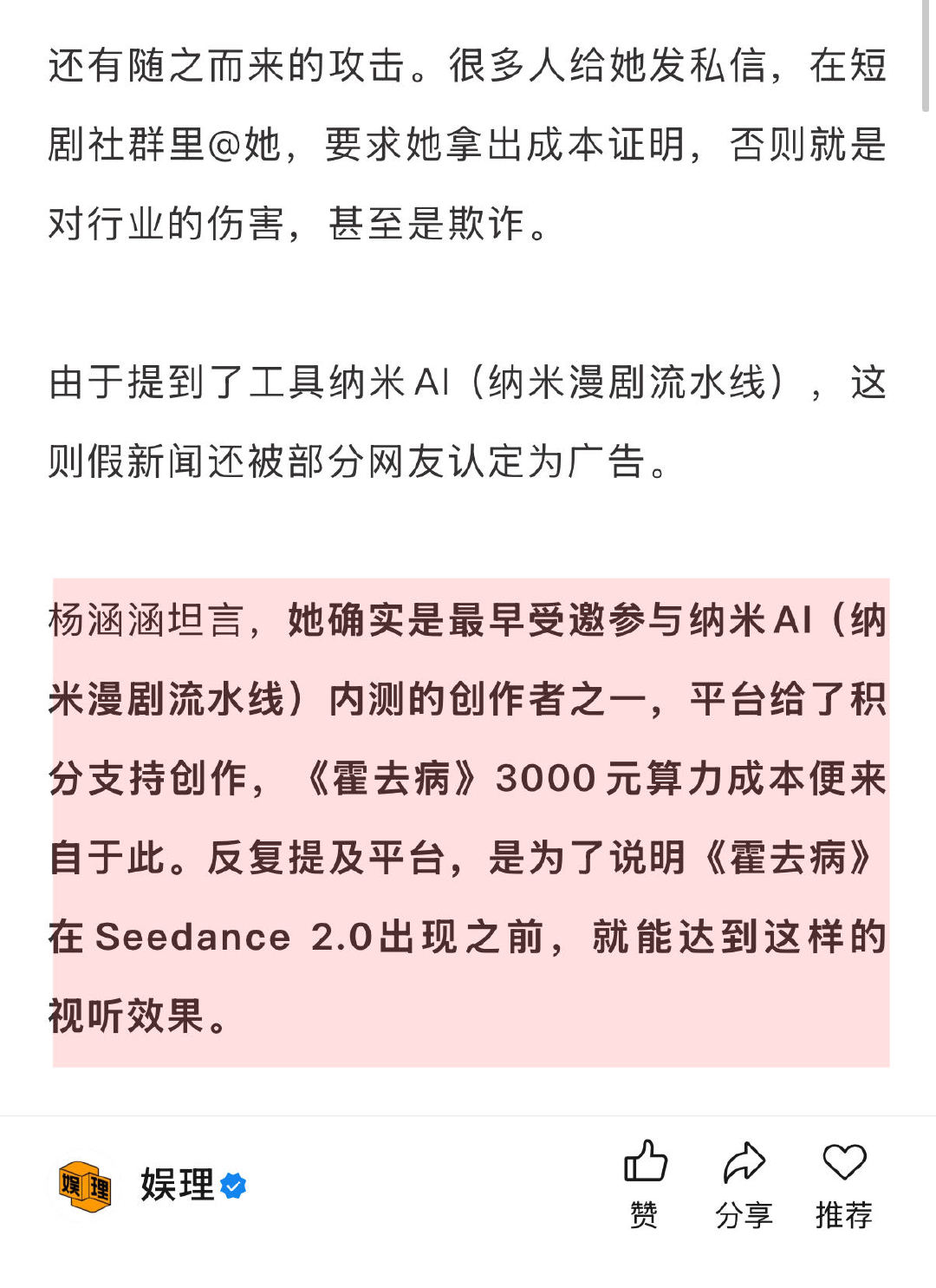 AI短剧霍去病导演否认营销炒作 AI短剧真的有暴富神话吗 由于澄清时提到了工具纳米AI(纳米漫剧流水线),这则假新闻还被部分网友认定为广告。AI短剧《霍去病》导演杨涵涵向坦言,她确实是最早受邀参与内测的创作者之一,平台给了积分支持创作,《霍去病》3000元算力成本便来自于此。提及平台是为了说明在Seedance 2.0出现之前,就能达到这样的视听效果…娱理独家↓