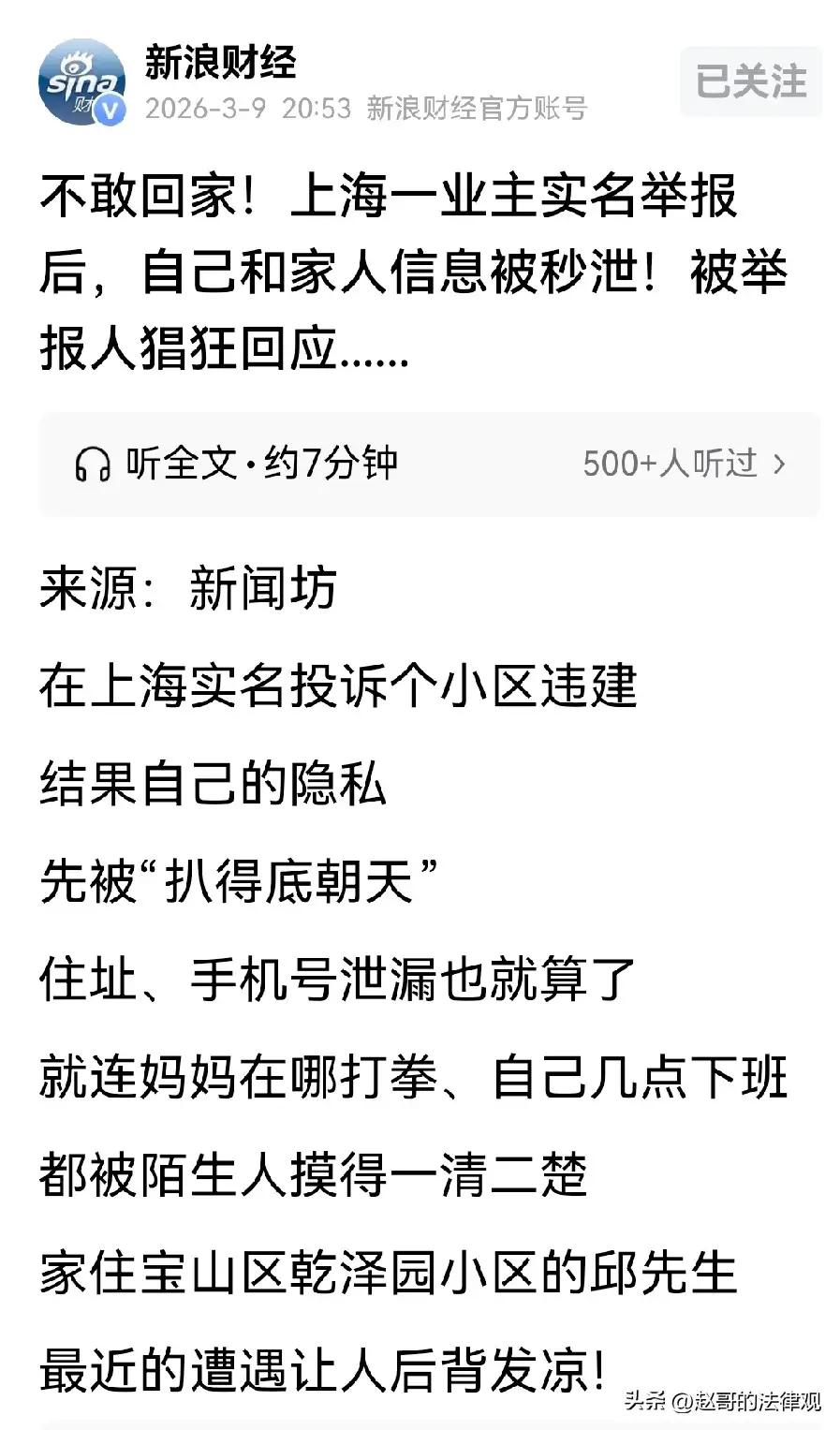 一纸举报背后的“裸奔”惊魂 今儿咱们单说一桩发生在申城上海的“寒蝉效应”。这事儿听着让人脊背发凉,仿佛一出精心编排的“惊悚剧”,可主角却是咱们身边普普通通的市民。话说这邱先生,住在上海宝山乾泽园,本是个遵纪守法的好公民。眼见邻居楼顶盖布,疑似违建,便依着规矩,通过12345平台实名举报,盼着还小区一个公道。谁曾想,这“正义之举”换来的不是嘉奖,竟是一场“从天而降”的无妄之灾。 这灾祸来得又急又狠。举报不过十分钟,那被举报的邻居竟如“神机妙算”般打来电话,不仅对他的举报内容“了如指掌”,更可怕的是,连他家的门牌号码、母亲晨练的去处、自己下班的钟点,都被对方像报家门一样抖落出来。这哪里是投诉,分明是把自己和一家老小的隐私,赤裸裸地摆在了对方面前。对方那句“你当天投诉,10分钟后我就知道了”的炫耀,简直比任何恐吓都来得刺骨。邱先生吓得有家不敢回,一家老小在外漂泊两周,这“提心吊胆”的日子,真真是“哑巴吃黄连,有苦说不出”。 但这“裸奔”的恐惧,藏着的正是咱们今天要说的“大健康”意识。真正的健康,讲究“内外双调”。外在,咱们得有个安全的居住环境,不必担心“祸从天降”;内在,更需要一个让人敢于发声、不必“人人自危”的心理环境。当举报成了“高风险行为”,当隐私成了随时可能被交易的“筹码”,这不仅是法治的悲哀,更是对公众安全感的极大破坏。我们要学会“感恩”那些仍在坚守正义的人,是他们的“较真”,让我们看到了流程中的漏洞,也让我们明白,真正的安全感,来自于信息的保密,来自于对规则的敬畏。 我们要感恩这次“血淋淋”的教训,是它让我们警醒,健康的社会生态,需要每一个人隐私得到保护,权利得到尊重。 愿世间少一些“内鬼”,多一些“守护者”。 愿你我皆安康,前程皆似锦!