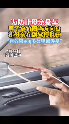 “人怎么能这么聪明!”四川,一男子的母亲晕车严重,为了让母亲舒服,男子找了一个树枝做方向盘,让母亲拿着,不料,竟 非常有效,开了300公里,一点没有晕,网友:最好的晕车药竟然是方向盘! 男子母亲晕车几十年,药贴偏方全没用,出门全是煎熬。他灵机一动,既然开车不晕,就用竹条做了个小方向盘,让母亲握着模拟驾驶。 三百多公里山路,母亲跟着转弯、直行,全程没晕。 这不是玄学,是科学。坐车时感官冲突,大脑混乱;模拟开车,有了掌控感,信号同步,不适自然消失。 最戳人的从来不是创意,而是藏在细节里的孝心。 不用花大钱,不用讲排场,把家人的难受放在心上,想尽办法让她舒服,就是最实在的孝顺。 一个小竹圈,抵过万千良药,温柔又治愈。