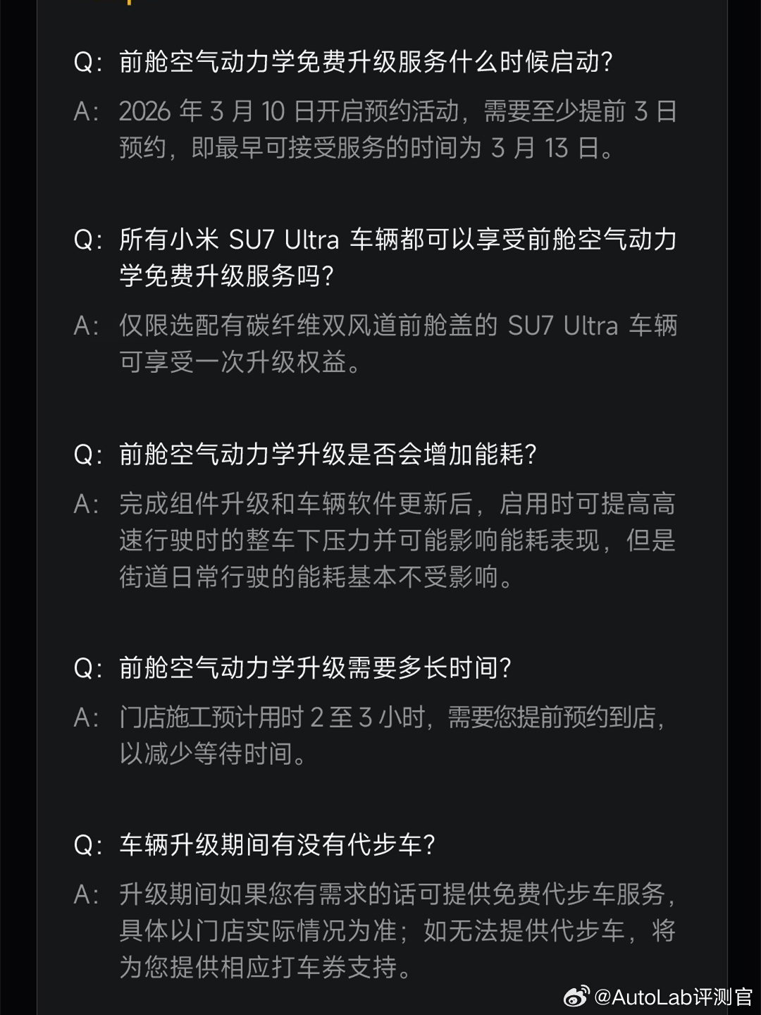 从官方FAQ来看,此次升级可以提高整车的下压力,但对日常街道行驶的能耗基本不受影响小米SU7Ultra开孔机盖车型开放升级