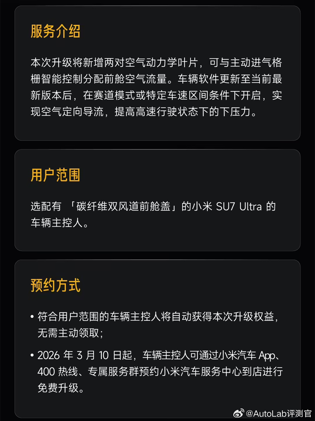 各位小米SU7 Ultra车主们注意了,即日起可以预约免费升级“前机盖”了,前提是购车时选配了「碳纤维双风道前舱盖」。