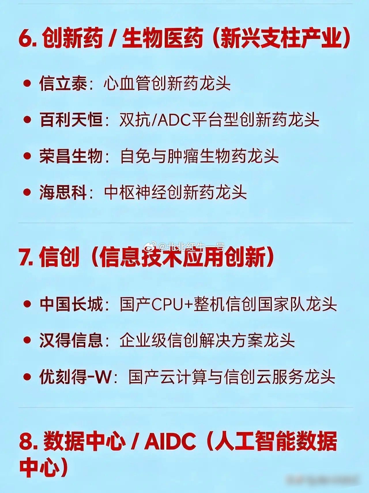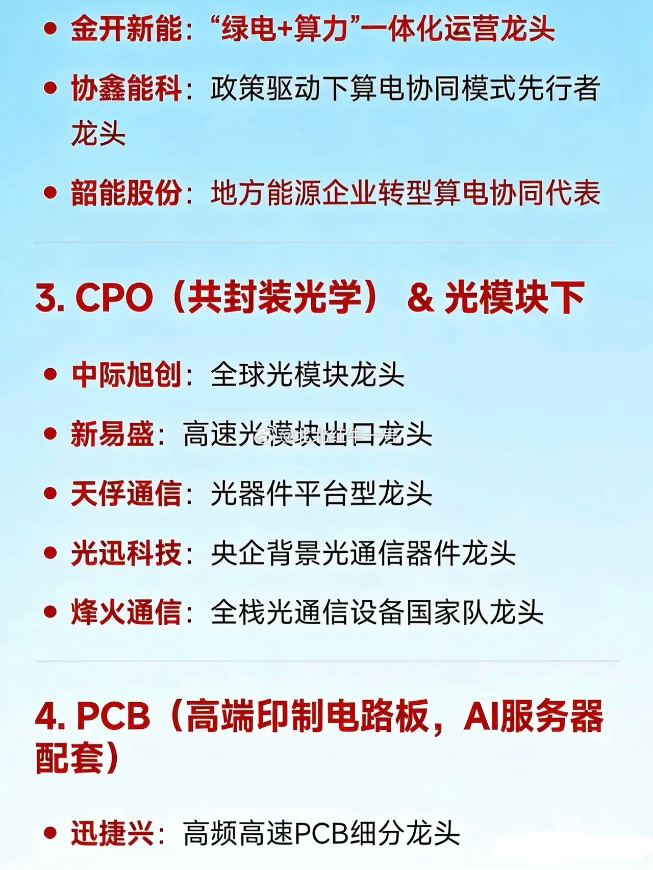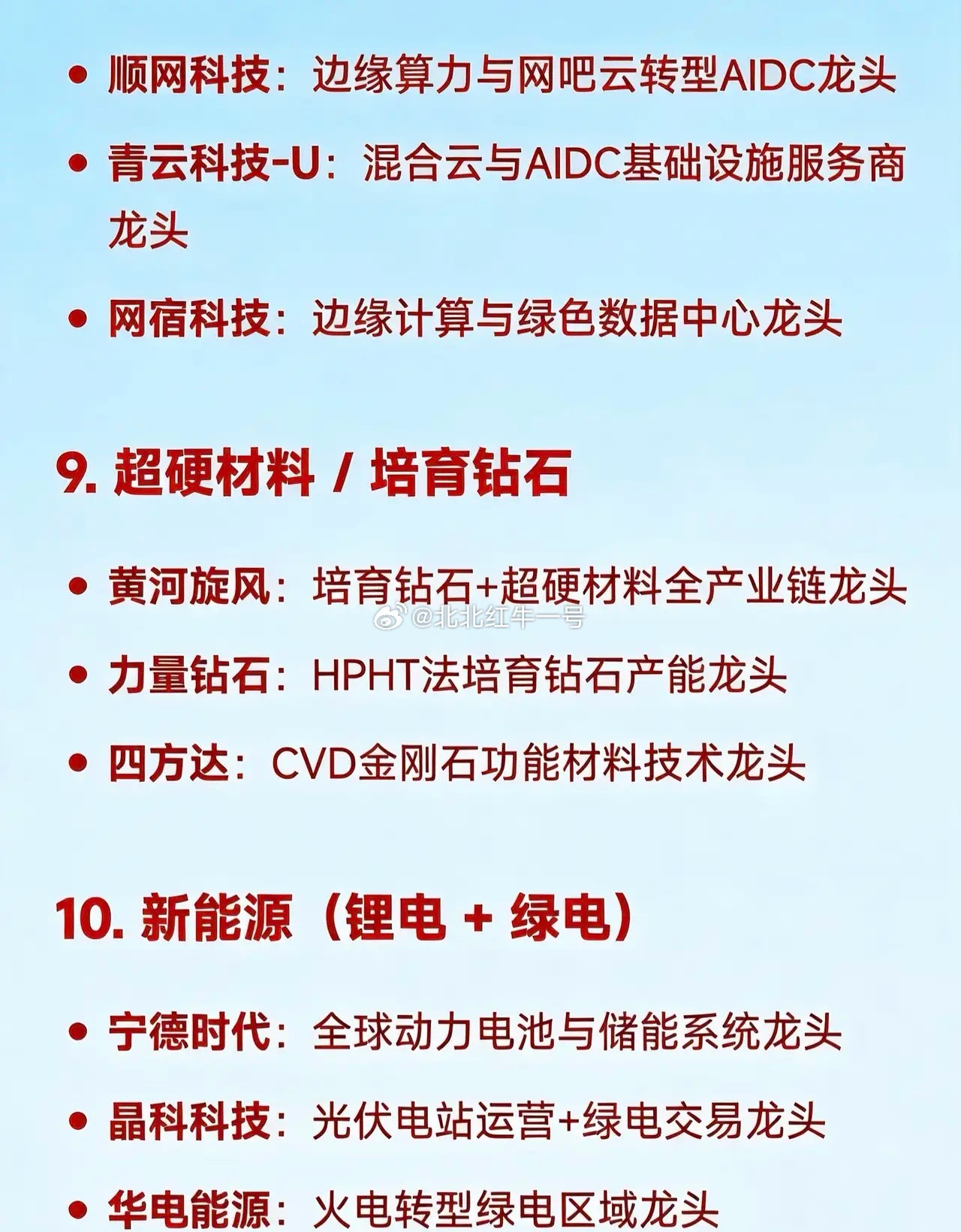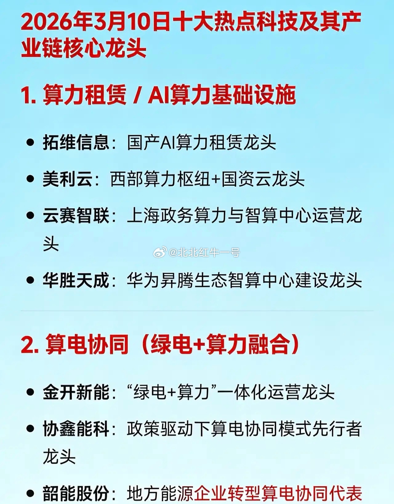 2026年3月10日十大热门科技及其产业链核心龙头1. 算力租赁 / AI算力基础设施拓维信息:国产AI算力租赁领军企业美利云:西部算力枢纽与国资云龙头企业云赛智联:上海政务算力与智算中心运营领军者华胜天成:华为昇腾生态智算中心建设龙头2. 算电协同(绿电+算力融合)金开新能:“绿电+算力”一体化运营龙头企业协鑫能科:政策驱动下算电协同模式先行龙头韶能股份:地方能源企业转型算电协同典型代表3. CPO(共封装光学) & 光模块中际旭创:全球光模块领军企业新易盛:高速光模块出口龙头企业天孚通信:光器件平台型龙头企业光迅科技:央企背景光通信器件领军者烽火通信:全栈光通信设备国家队龙头4. PCB(高端印制电路板,AI服务器配套)迅捷兴:高频高速PCB细分领域龙头广合科技:AI服务器PCB核心供应商龙头金安国纪:覆铜板 - PCB一体化龙头企业联瑞新材:PCB上游硅微粉材料龙头企业5. 商业航天航天电器:航天电子元器件龙头企业中衡设计:商业发射场基建设计龙头企业中国西电:航天配套电力装备龙头企业6. 创新药 / 生物医药(新兴支柱产业)信立泰:心血管创新药龙头企业百利天恒:双抗/ADC平台型创新药领军者荣昌生物:自免与肿瘤生物药龙头企业海思科:中枢神经创新药龙头企业7. 信创(信息技术应用创新)中国长城:国产CPU+整机信创国家队龙头企业汉得信息:企业级信创解决方案龙头企业优刻得 - W:国产云计算与信创云服务龙头企业8. 数据中心 / AIDC(人工智能数据中心)顺网科技:边缘算力与网吧云转型AIDC龙头企业青云科技 - U:混合云与AIDC基础设施服务商龙头网宿科技:边缘计算与绿色数据中心龙头企业9. 超硬材料 / 培育钻石黄河旋风:培育钻石+超硬材料全产业链龙头企业力量钻石:HPHT法培育钻石产能龙头企业四方达:CVD金刚石功能材料技术龙头企业10. 新能源(锂电 + 绿电)宁德时代:全球动力电池与储能系统龙头企业晶科科技:光伏电站运营+绿电交易龙头企业华电能源:火电转型绿电区域龙头企业