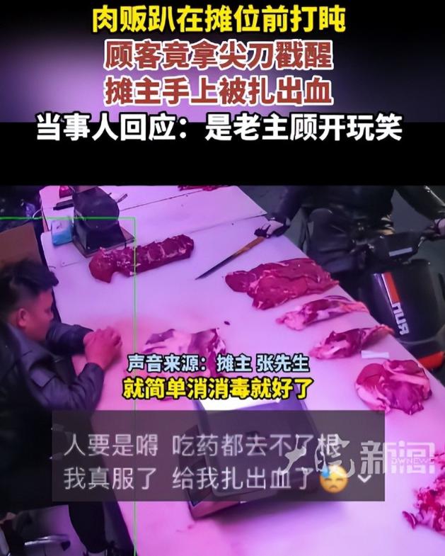 太奇葩了!辽宁沈阳,一位猪肉铺摊主正趴在桌子上休息,谁知这时一名顾客前来卖肉,直接拿起桌上的刀子将老板戳醒,老板因此受了小伤,但看到对方是老客户,想想还是算了,没有追究。网友:还有这种唤醒人的法子? 当天,张先生忙活了大半天,中午实在撑不住,就趴在肉摊上睡着了。菜市场里人来人往,他也没想太多,就这么眯一会儿 睡得正沉的时候,手背突然传来一阵刺痛,张先生猛地惊醒。睁眼一看,手背在冒血,旁边站着个熟面孔,手里还握着摊上那把割肉的刀 这位老主顾看他醒了,跟没事人一样说了句:给我割两斤肉 张先生当时脑子都是懵的。低头看看手背上的口子,又看看那把刀,再看看这位老顾客一脸理所当然的表情,一时间都不知道该说什么 后来才知道,这位老主顾来买肉,看见他在睡觉,喊了两声没喊醒。正常人这时候要么等等,要么拍拍肩膀,结果这位倒好,直接抄起摊上的刀,对着手背就是一下 这操作,说实话,正常人想破脑袋都想不出来 伤口虽然不大,但也见了血。张先生后来自己去做了消毒处理,好在没什么大碍。他说这个顾客是常来的老主顾,对方应该也不是真想伤人,可能就是没想那么多,以为轻轻戳一下能把人叫醒 这话说得已经很给面子了。换成别人,这一刀戳下去,报警验伤都是轻的。刀子这种东西,哪能随便往人身上招呼? 张先生最后选择了不追究。他说大家都是熟人,对方也没恶意,这事就这么算了 网上看到这事的人都说,这老主顾是命好,遇上个脾气好的摊主。换个脾气爆的,这一刀下去,就不是买肉的事了,非得打起来不可 不得不说,有些人的脑回路,真的理解不了。在他们看来,用刀戳人跟用手拍人没区别,反正都是为了叫醒你。至于刀会不会伤人,他们压根没往那想 这种人不是坏,是真的钝。对别人的感受钝,对基本的安全常识钝,对人与人之间该有的边界感也钝。他们活在自己的世界里,想干什么就干什么,从来没想过自己的行为会让别人多疼 张先生不追究是他的大度,但这位老主顾也该想想,下次要叫醒睡觉的人,能不能换个方式。实在不行,等等也行,肉又跑不了