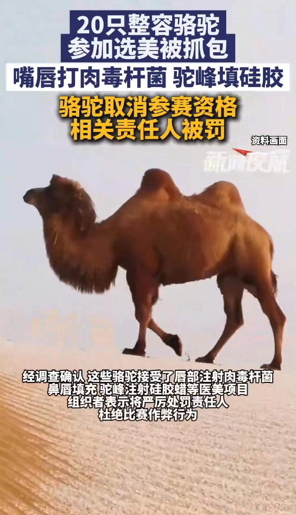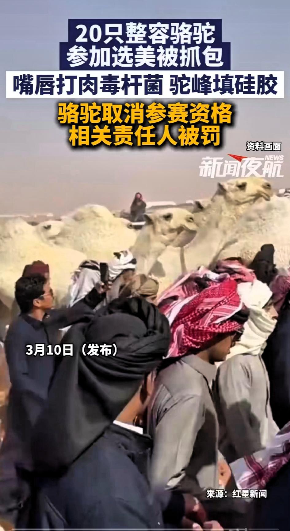 20只整容骆驼参加选美被抓包,嘴唇打肉毒杆菌,驼峰填硅胶,最终这些整容的骆驼被取消参赛资格,相关人员也受到惩罚。 2026年2月8日,阿曼骆驼选美大赛热闹开场,这可是体现当地文化的传统赛事。来自各地的饲养者带着自家骆驼来角逐“最美骆驼”。以往,大家通过选择性育种和外貌修饰让骆驼变美,参赛骆驼还会戴上精美配饰。 但这次有20头骆驼“翻车”了。兽医检查发现,它们为了迎合审美,嘴唇打肉毒杆菌、驼峰填硅胶,被网友调侃成“骆驼卡戴珊”。 最终,这20头骆驼被取消参赛资格,相关负责人也遭严厉处罚。主办方坚决打击舞弊,毕竟骆驼选美竞争激烈,奖金丰厚,可不能让这些歪门邪道毁了传统赛事。 谁能想到骆驼为了比赛,也要丰唇丰胸,仪态万千,看来外国人在整容方面比国人还要疯狂。 国内都是人整容,还没见过哪个宠物参加比赛去整容。 这些外国人为了赢奖金,真是无所不用其极,给骆驼整容也算是开眼了。