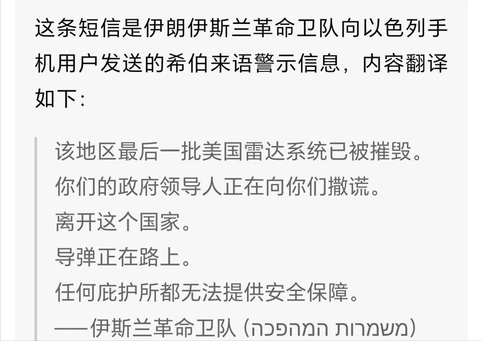伊朗也开始玩三十六计了,发射导弹前,提前给以色列市民发短信,告诉他们,美国雷达已经被摧毁,我们的导弹在路上,快点离开这个国家。   当地时间3月9日,这条落款为伊朗伊斯兰革命卫队的希伯来语短信,直接群发到了以色列全境的手机用户手中,一时间激起千层浪,整个以色列民众陷入一片恐慌。   可能很多人觉得,打仗就是真刀真枪地干,哪有提前给敌人市民通风报信的道理?但伊朗偏不按常理出牌,这一步走得既大胆又精妙,绝非一时兴起。   伊朗此前已经连续摧毁了美军在中东的7部关键预警雷达,包括萨德系统的核心雷达,彻底撕开了以色列的防空屏障,让美以防空预警时间大幅压缩,反导体系近乎“失明”,这时候给以色列市民发短信,每一句话都戳中了民众的要害。   短信里的内容字字诛心,却比任何导弹都更能动摇人心——美国雷达被摧毁,意味着以色列的防空形同虚设,导弹随时可能落地;让市民离开这个国家,看似是提醒,实则是在告诉他们,你们的政府根本保护不了你们。   果不其然,短信发出后,以色列社交平台瞬间被刷屏,多地出现民众抢购物资、涌向机场和边境口岸的混乱场景,人心惶惶之下,原本紧绷的社会情绪产生了相当规模的失控。   以色列官方急着出来灭火,把这事定性为伊朗的心理战,呼吁民众保持冷静、不要相信外界信息,但这种苍白的安抚,在实打实的安全威胁面前,显得不堪一击。   毕竟,伊朗的导弹是真的在路上,美国的雷达也是真的被摧毁,民众的恐惧不是凭空产生的,而是实实在在的生存危机。伊朗这招,看似仁至义尽,实则攻心为上,核心就是要离间以色列市民和他们的政府,把矛盾彻底转移到两者之间。   大家别忘了,这场冲突的根源,是美以联军主动发动对伊朗的军事打击,伊朗从头到尾都是被侵略的一方。自从2月28日美以联军发起进攻以来,伊朗境内已有上千人死亡、上万人受伤,大量民生和军事设施被摧毁,承受了巨大的损失。   而伊朗的反击,从来都不是盲目报复,而是精准施策,这波短信预警,就是最聪明的一步。   最讽刺的地方就在这里:美以联军一起侵略伊朗,最后挨炸、受苦的却是以色列的普通民众,远在大洋彼岸的美国,几乎一点事都没有。   美军虽然在中东的基地遭到袭击,但本土从未被波及,甚至还在源源不断地向以色列输送武器,坐看以色列民众陷入战火。以色列的政府跟着美国冲锋陷阵,看似强硬,实则是把自己的人民推向了灾难的深渊。   伊朗就是看透了这一点,才想出这样的攻心之计。它没有直接喊话以色列政府,而是绕开官方,直接对接普通民众,让他们看清一个现实:你们的政府跟着美国侵略别的国家,换来的不是安全,而是导弹和毁灭;美国只会坐收渔利,根本不会在乎你们的死活。   这种心理冲击,远比导弹的物理打击更具破坏力,一旦民众对政府失去信任,以色列的内部就会出现裂痕,这正是伊朗想要达到的效果。   美以联军仗着军事优势,对伊朗狂轰滥炸,无视伊朗民众的生命安全,伊朗只不过是用同样的方式,让以色列民众感受一下被战火笼罩的恐惧,让他们明白,战争的代价,最终都会落到普通百姓身上。   如今,美以伊的对抗还在持续,伊朗的“不对称反击”让美以陷入巨大的消耗,而这波短信心理战,更是让以色列陷入了内忧外患的境地。   伊朗用实际行动证明,真正的强大,从来不是靠武力威慑,而是靠精准的策略和人心的向背。