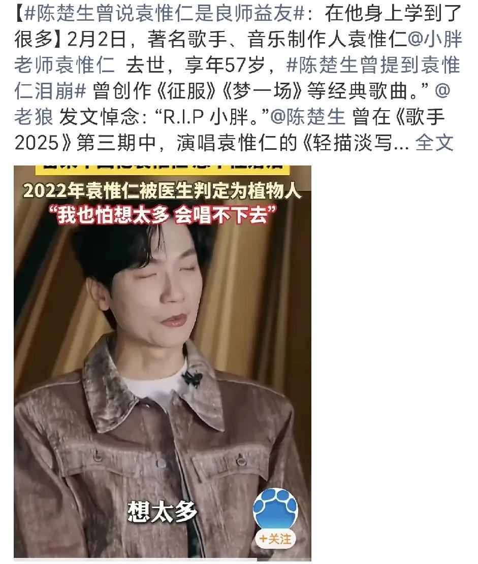 袁惟仁告别仪式今天举行,陈楚生以他自己的方式表达了对亦师亦友的小胖老师的悼念! 他又弹唱了《轻描淡写》,面前放着袁惟仁的专辑,专辑上的袁惟仁在弹着吉他,陈楚生也弹起了吉他,没有过多的言语,一只白色的蜡烛,所有的思念都放在歌声里。 全亚洲都唱他的歌,陈楚生是个重感情的人, 从此后陪伴他的只有小胖老师送他的那个调音器了[可怜] 袁惟仁