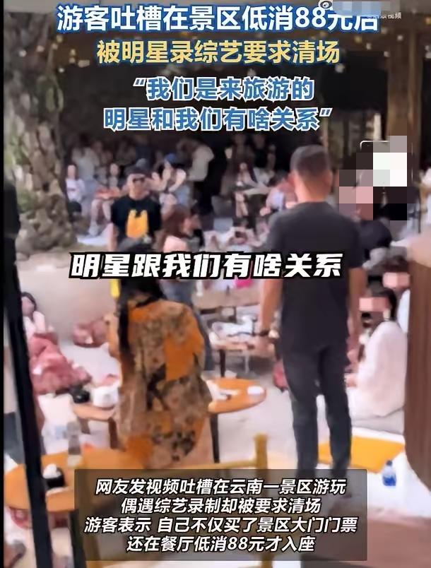 景区和节目组协商不当,凭什么要让无辜游客来背! 游客千里迢迢奔赴景区,花真金白银买票游玩,却只因几位艺人录制综艺,就被蛮横清场、随意刁难,景区还公然偏袒节目组,让花钱消费的游客沦为配角,太过分! 有游客为了打卡心仪景点,特意飞了3000公里赶赴目的地,通过正规渠道买好门票,满心欢喜准备游玩,结果刚到景区,就被通知因节目组录制需要,要求立刻离开该区域。更离谱的是,景区事前没有任何通知,没告知该区域有游玩时间限制,也没说明会因综艺录制清场,游客的正当游玩权被直接无视。 不仅如此,节目组的操作更是让人火大:想进入相关区域,竟要求游客进餐厅抵销88元才行;就连远处围观的粉丝,都被吆五喝六要求必须坐下,不准站立,工作人员态度恶劣,丝毫没有尊重可言。面对游客的不满和质疑,景区负责人非但不维护游客权益,反而一味站在节目组这边,完全不把花钱消费的游客当回事,事后还狡辩该区域是不常开放的限制区域,试图掩盖自己的失职。 花了钱、跑了远路,不是来开心游玩,而是来受气、被驱赶,换谁都难以接受!游客通过正规途径购票,就理应享有完整的游玩权利,景区作为经营方,有义务保障游客的合法权益,而非为了迎合节目组,肆意侵犯游客利益。