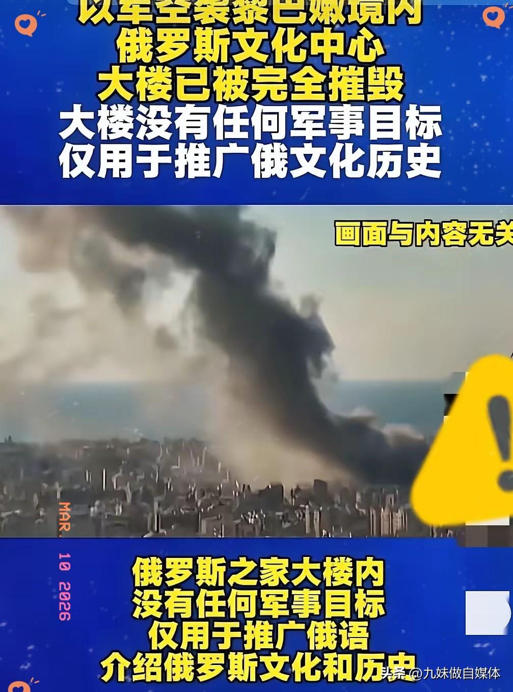这下以色列真捅大娄子了! 3月9日最新消息,以色列空袭黎巴嫩, 没想到,被炸成废墟的,竟然是俄罗斯文化中心! 俄文化中心属民用设施,无军事部署,此次空袭无人员伤亡。 俄方已发声抗议,要求以方给出明确解释并承担责任。 此次误击让地区外交局势骤然升级,多方关系更趋紧张。 以方军事行动范围扩大,已引发多国对其行为的不满。 军事行动需严守底线,误击他国民用设施只会加剧地区矛盾。