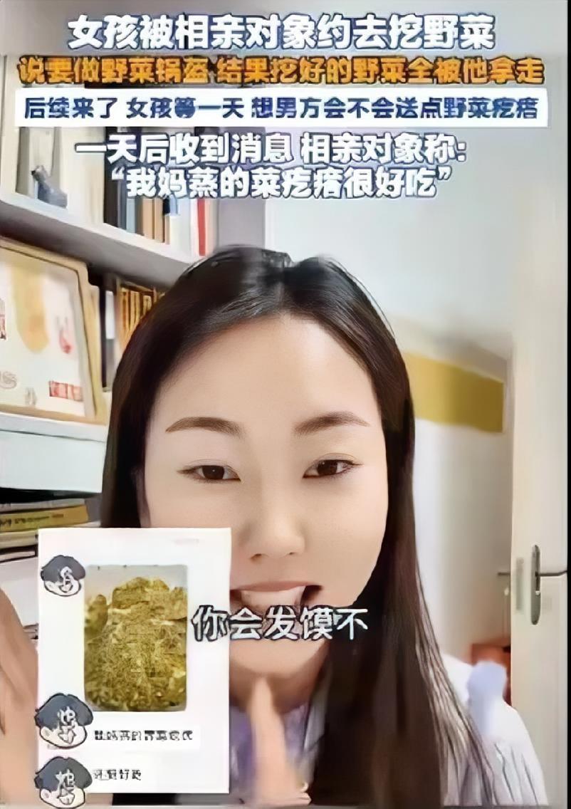 “离谱到家”!陕西咸阳,一女孩被相亲对象约去挖野菜,不仅挖好的全被男生拿走,一天后还收到男孩消息:“我妈蒸的菜疙瘩很好吃!” 原来是男生主动约的女孩,还说要体验接地气的约会,就带着女孩一起去挖野菜了,更说要做野菜锅盔一起吃。女孩一听,也觉得挺新鲜,就开开心心跟着去了。 之后俩人一起挖了半天,结果临走的时候,男生把所有野菜打包全带走了,一棵都没给女孩留。女孩当时心里就有点不是滋味,但也没好意思说啥。 但她还傻等了一天,心想对方就算不送野菜,怎么也得分点菜疙瘩吧?结果只等来男生一句轻飘飘的话:我妈蒸的菜疙瘩很好吃! 网友也直接炸锅了:这哪是相亲,分明是找了个免费挖野菜的搭子啊!也有人调侃:洗三遍、加调料,做完只告诉你好吃,绝了! 还有人说:这纯纯凭实力单身,下次收麦子可别再约人家了。 只能说,细节见人品,相亲真的能看清一个人的本质啊!你遇到过这么奇葩的相亲对象吗?换你会怎么做呢?