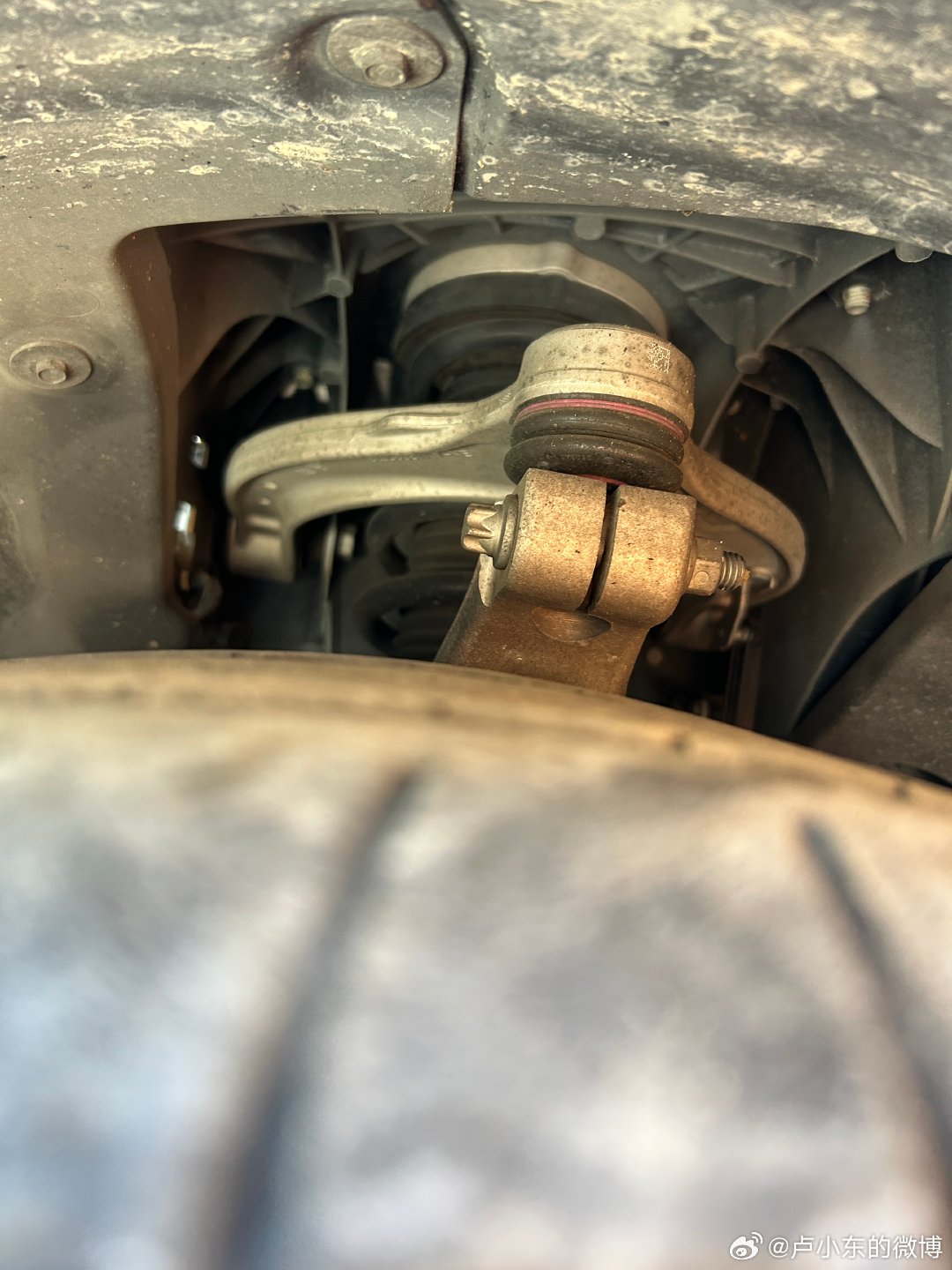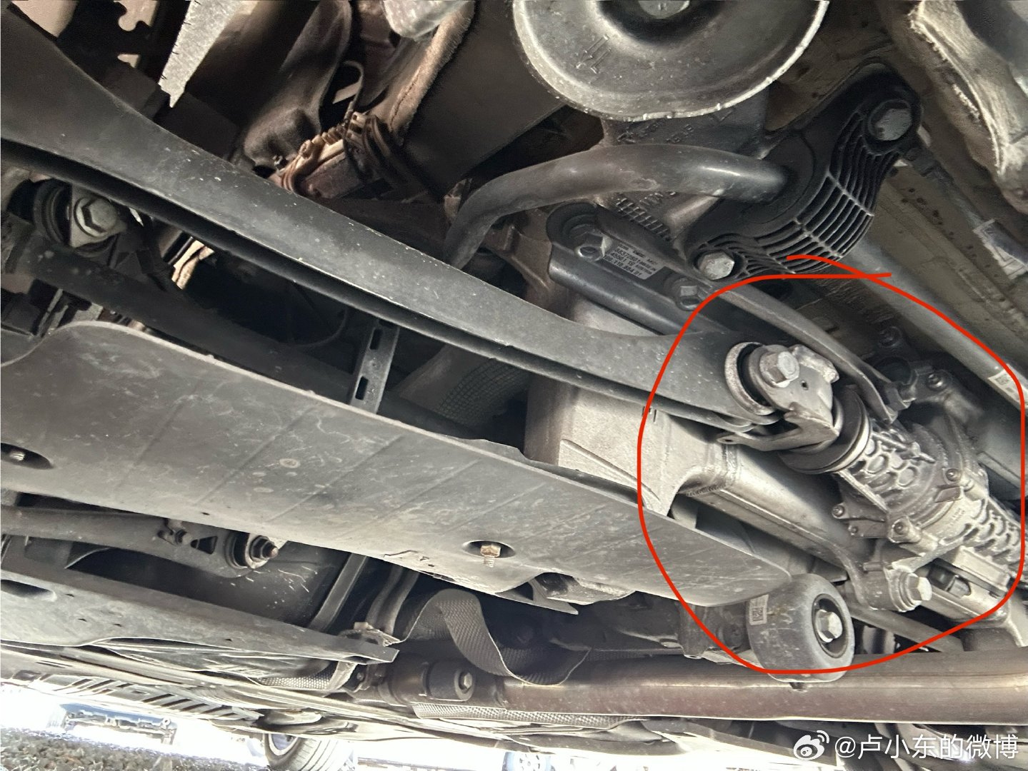 这新 5 系的用料还是挺足的,前悬挂是铝合金塔顶+双叉臂结构,上下摆臂都是压铸铝的。而且这车挺有意思,一个中不溜配置的 5 系居然还带后轮转向。这车后悬挂的左右两根上摆臂中间连着一个微型的转向机,可以靠收紧或者推出拉杆而改变后轮的前束角,实现一些非常轻微的后轮转向。实测的话,说实话...没啥感觉。