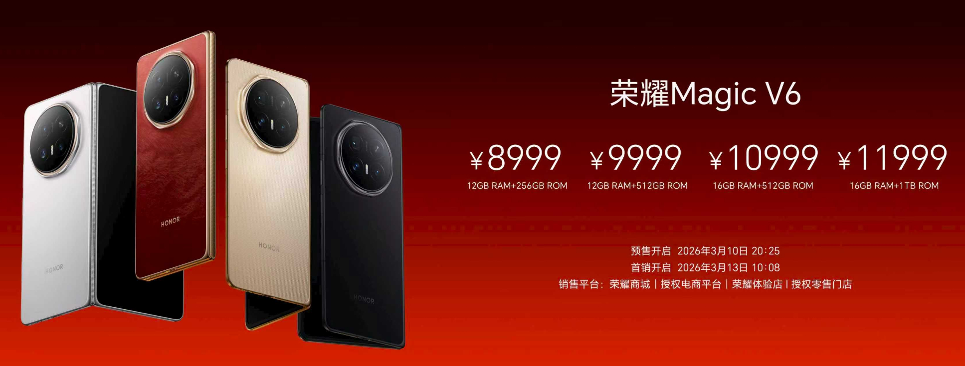 荣耀Magic V6 价格来了!!12GB+256GB:8999 元12GB+512GB:9999 元16GB+512GB:10999 元16GB+1TB:11999 元