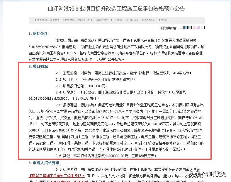 4461.9万元!陕建拟中标西安这个大型商业项目提升改造施工... 近日,西安公共资源交易中心发布了《曲江海港城商业项目提升改造工程施工总承包中标候选人公示》,这一消息引起了建筑行业和商业领域的广泛关注。 公示内容显示: 曲江海港城商业项目提升改造工程施工总承包,招标人为西安金美达商业地产开发有限公司; 第一中标候选人是陕西建工第十建设集团有限公司,投标报价为 44619056.17 元; 第二中标候选人是中建二局第二建筑工程有限公司,投标报价 42436554.17 元; 第三中标候选人则是中天西北建设投资集团有限公司,投标报价 44971147.83 元。 这三家企业在建筑领域都有着丰富的经验和良好的口碑,此次参与曲江海港城项目的竞标,无疑是对自身实力的一次展示。 据悉,本次招标的曲江海港城商业项目提升改造工程施工总承包,位于西安曲江新区雁南一路北侧,慈恩西路东侧,投资总额5000万元,工程规模:对原负一层商业进行提升改造,新增6部电梯,改造面积约15184平方米; 本次招标范围:本项目对原海港城出入口、地下室和内部空间进行改造,改造面积约15184平方米。 主要内容为: 1、地下一层部分区域改造为交通空间,连接一层和负一层交通,改造后面积减少496.82㎡; 2、地下一层东南角部分区域增加夹层,面积增加496.82㎡; 3、地下室面积无变化,地上总建筑面积无变化。 4、改造后总建筑面积为81998 ㎡不变,其中地上建筑面积36063㎡、地下面积45935㎡均不变。建筑高度、建筑密度、容积率、绿地率等规划指标均不变。 本次提升改造主要涉及建筑工程、结构拆除及加固工程、给排水工程、通风与空调工程、电气工程、建筑装饰装修工程、消防工程、智能化工程、电梯工程、幕墙工程。 本次招标范围为工程施工,直至竣工验收合格并整体移交,工程保修期内的缺陷修复和保修工作,同时承担相关协调工作,具体内容详见招标文件、工程量清单及施工图纸。; 公开信息显示,本次招标的曲江海港城商业项目地理位置优越,紧邻亚洲最大的唐风商业文化步行街西安大唐不夜城;此前,该项目已由华发集团接手进行升级改造,于2025年9月29日正式更名为“锦安坊”并亮相。作为华发集团在西北地区的首个商业项目,“锦安坊”承载着华发集团开拓西北商业市场的战略布局和美好愿景。 项目以盛唐文化为核心,打造“意·游·味·境”一体的唐风现代复合型街区,外立面提取大雁塔建筑风骨,采用唐长安“红、金、绿”经典色系,融合传统唐风与现代审美。内部设有南街雅宴、北巷市井、中庭市集三大开放式主题区,形成“可感可参与的城市微缩生态圈”。 项目引入西北首店“武皇盛宴”沉浸式文化餐厅,以及八百里秦川陕菜、MAANUP漫+休闲社交空间等多元品牌,同时通过派对式KTV、民谣音乐现场、电竞酒店等夜娱业态,打造“越夜越精彩”的盛唐主题社交场。 本次陕西建工第十建设集团有限公司作为第一中标候选人,具有强大的企业实力和良好的信誉,成立于1950年,是陕西省国资委监管,陕建控股集团旗下的全资子公司。注册资本金3亿元,年施工能力100亿元以上,年施工面积500万平方米以上,是陕南地区最大的国有建筑施工企业。 本次曲江海港城商业项目提升改造工程完成后,“锦安坊”有望成为西安商业的新地标。一方面,其独特的文化定位和丰富的业态组合将吸引大量消费者前来购物、休闲和体验,提升街区的商业价值和知名度;另一方面,项目的成功运营也将为西安的文化传承和推广做出贡献,让更多的人了解和感受盛唐文化的魅力。同时,对于华发集团来说,“锦安坊”的成功将为其在西北地区的商业布局奠定坚实的基础,为后续项目的开发提供宝贵的经验和借鉴。