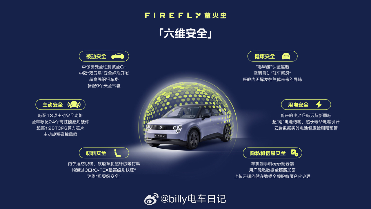很多人觉得小车天生就要在安全上做减法,但firefly萤火虫这台车反而有点“反着来”。它搞了一套所谓的六维安全:主动安全、被动安全、用电安全、材料安全、健康安全,还有隐私信息安全。