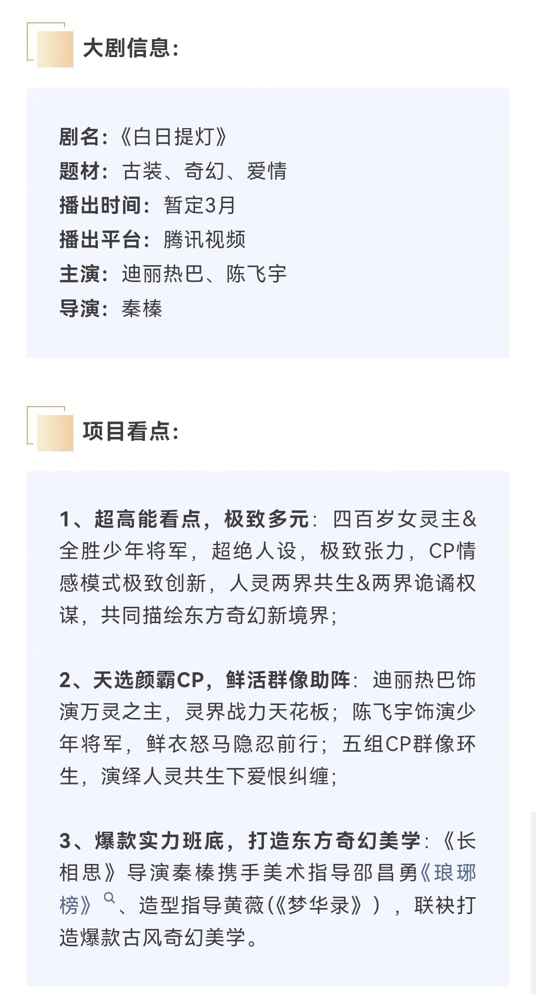 🐧超级S+奇幻大剧《白日提灯》暂定3.28号上线,项目看点👇✅ 人设新颖:400岁女灵主 × 少年将军✅ 女美男帅:迪丽热巴 × 陈飞宇✅ 金牌班底:长相思导演、琅琊榜美术指导
