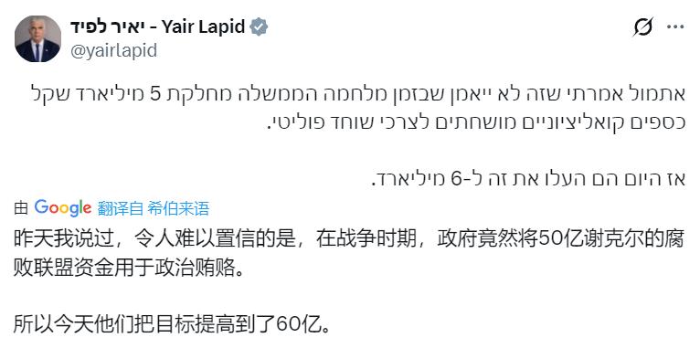 以色列国会反对派领导人亚伊尔·拉皮德:令人难以置信的是,在战争时期,政府竟然将50亿谢克尔的腐败联盟资金用于政治贿赂。