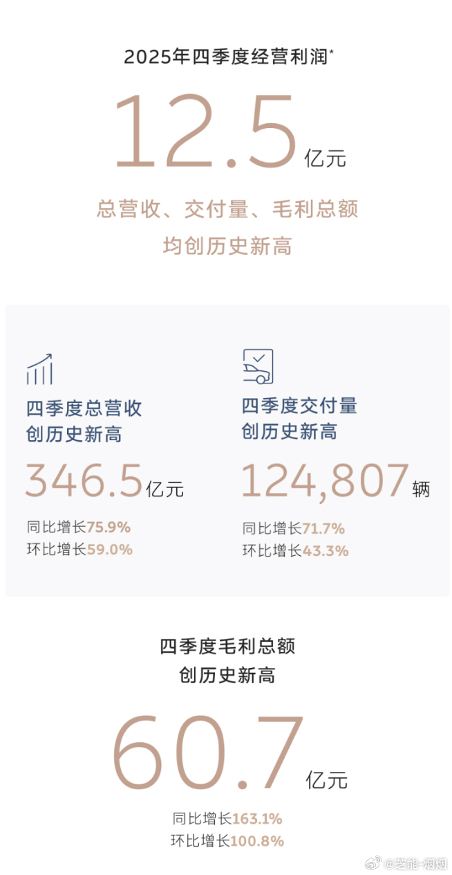 蔚来四季度盈利12.5亿元 蔚来刚刚交出一份挺关键的成绩单,2025年Q4首次实现季度经营盈利,利润12.5亿元;现金储备来到459亿元,环比多了近百亿,现金流明显在变健康。交付12.48万辆、营收346.5亿元、毛利率17.5%,多项数据都创了阶段新高。