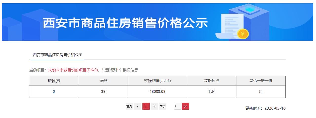 快讯!刚刚,西安住建局官网公示了西部大道板块“中粮·大悦未来城 | 悦著·央宸项目”新一批房源的价格,均价18000.93元/㎡! 中粮·大悦未来城项目位于西安长安区广场北路以东、清凉山森林公园南侧,总占地980亩,分5期开发,已摘地2宗。 其中,项目二期中粮·大悦未来城 | 悦著·央宸项目(大悦未来城景悦府项目(DK-9))位于西安市长安区工会医院以东、西部大道以南,占地面积约73亩,容积率3.3,规划10栋住宅,包含2栋洋房、8栋高层。 项目规划5所幼儿园、2所小学、1所中学,形成“幼儿园+小学+初中”全龄教育体系。目前,一期配建的西交大附小分校(西安长安区第十六小学)已正式开学,配套中学(交大附中)预计2026年9月投入使用。 项目规划25万㎡大悦城商业综合体,西侧有西安工会医院(约200米),北侧紧邻清凉山森林公园,距离西安地铁2号线凤栖原站约1.2公里! 此外,项目围绕下沉景观庭院打造邻里专属空间,涵盖健身房、瑜伽&舞蹈室、书院、会客厅、休闲室、儿童中心等功能空间;精心打造架空层空间,涵盖多个儿童活动区,以及休闲室、茶室等。 本次价格公示,项目公示了目二期中粮·大悦未来城 | 悦著·央宸项目2