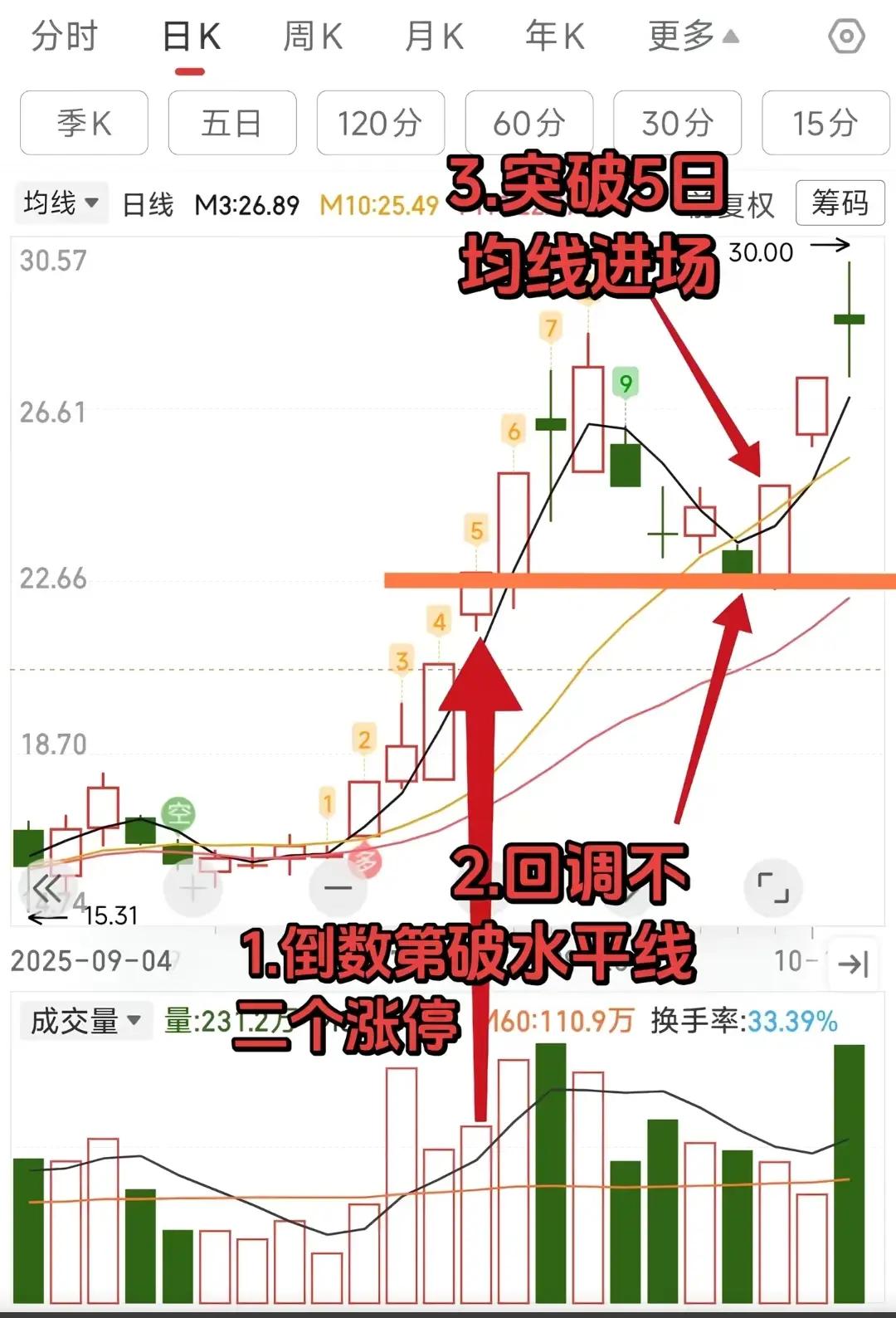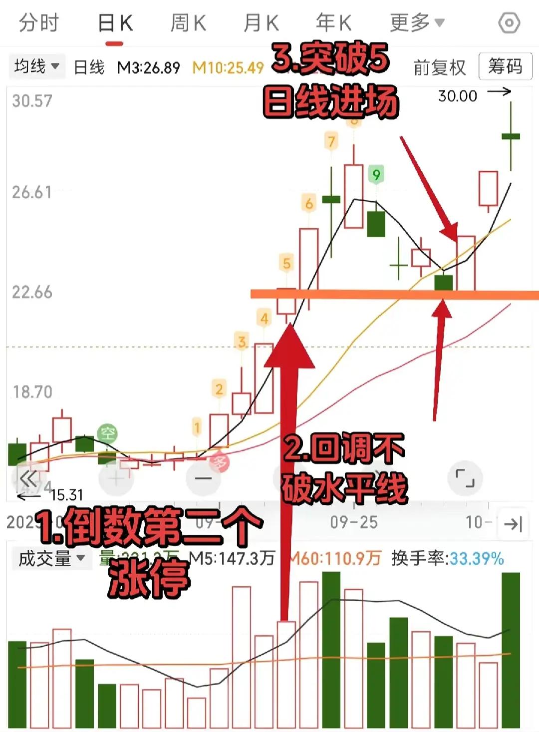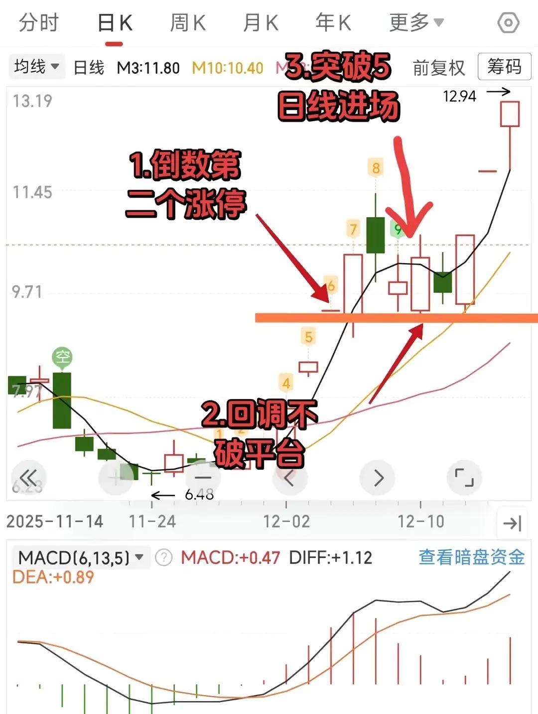 追龙极简战法:捕捉连板牛股起涨点 散户追连板常因节奏错乱被套或踏空,本战法通过三信号精准锁定二次拉升起点。 信号一:倒数第二板须实质性放量 成交量需显著高于近期均值,且封单坚决,证明大资金高位换筹、做多意愿强。若缩量,则连板高度受限,此乃战法核心前提。 信号二:回调不破关键水平线 于倒数第二板收盘价画水平线作为“强势支撑线”。回调不破,表明承接有力,属洗盘非反转;一旦跌破,多为资金出逃信号,需规避。 信号三:放量突破5日线即进场 5日线为短期生命线。股价于水平线企稳后,若放量突破5日线,标志洗盘结束、主升浪将启,此为最佳买点。 核心逻辑: 先定强势(放量)→ 再验支撑(不破线)→ 最后寻买点(破五线)。三信号缺一不可,可大幅提升胜率,助散户从盲目追高转为精准布局。