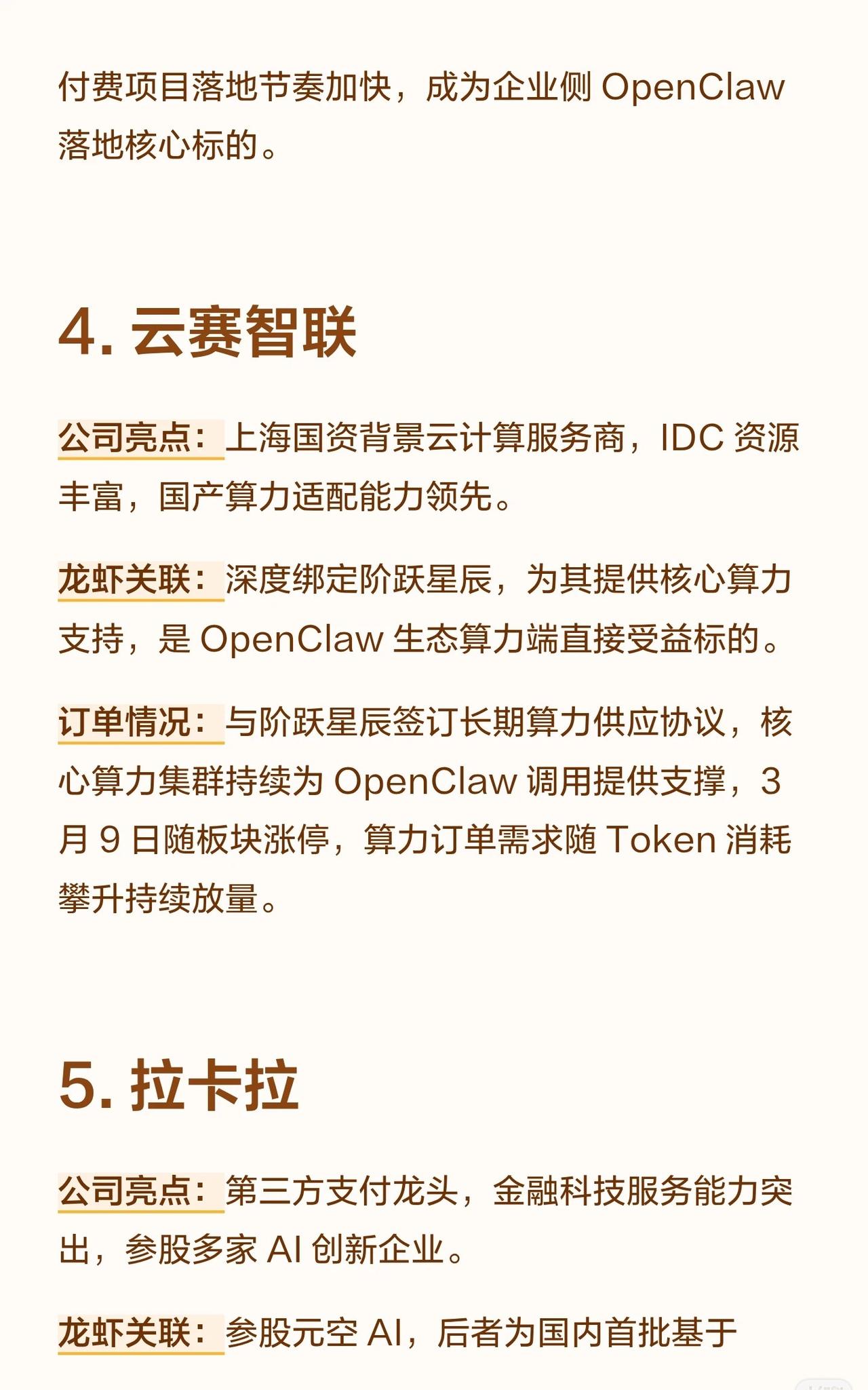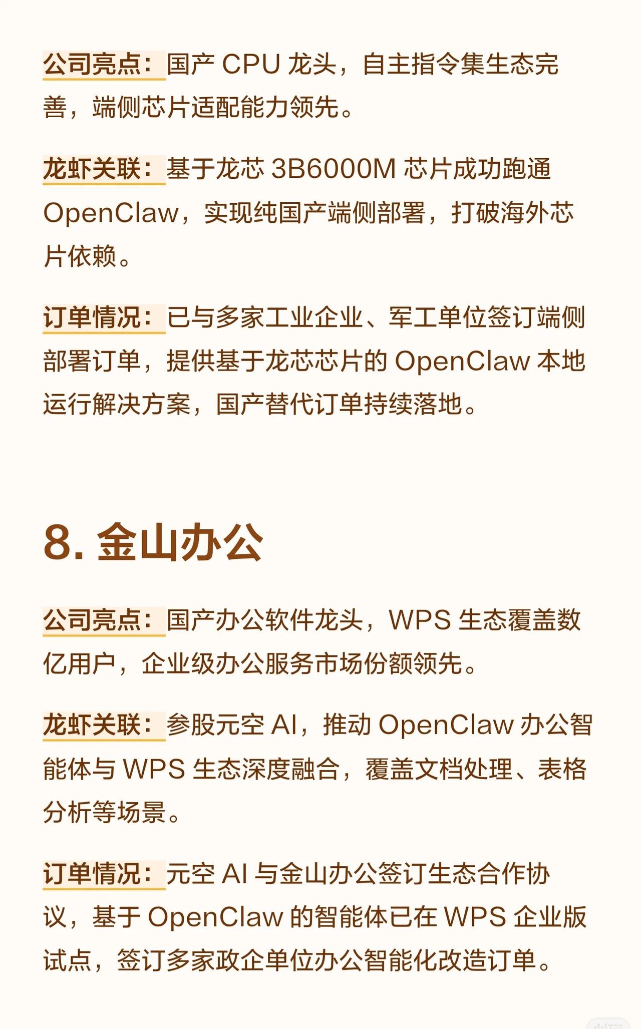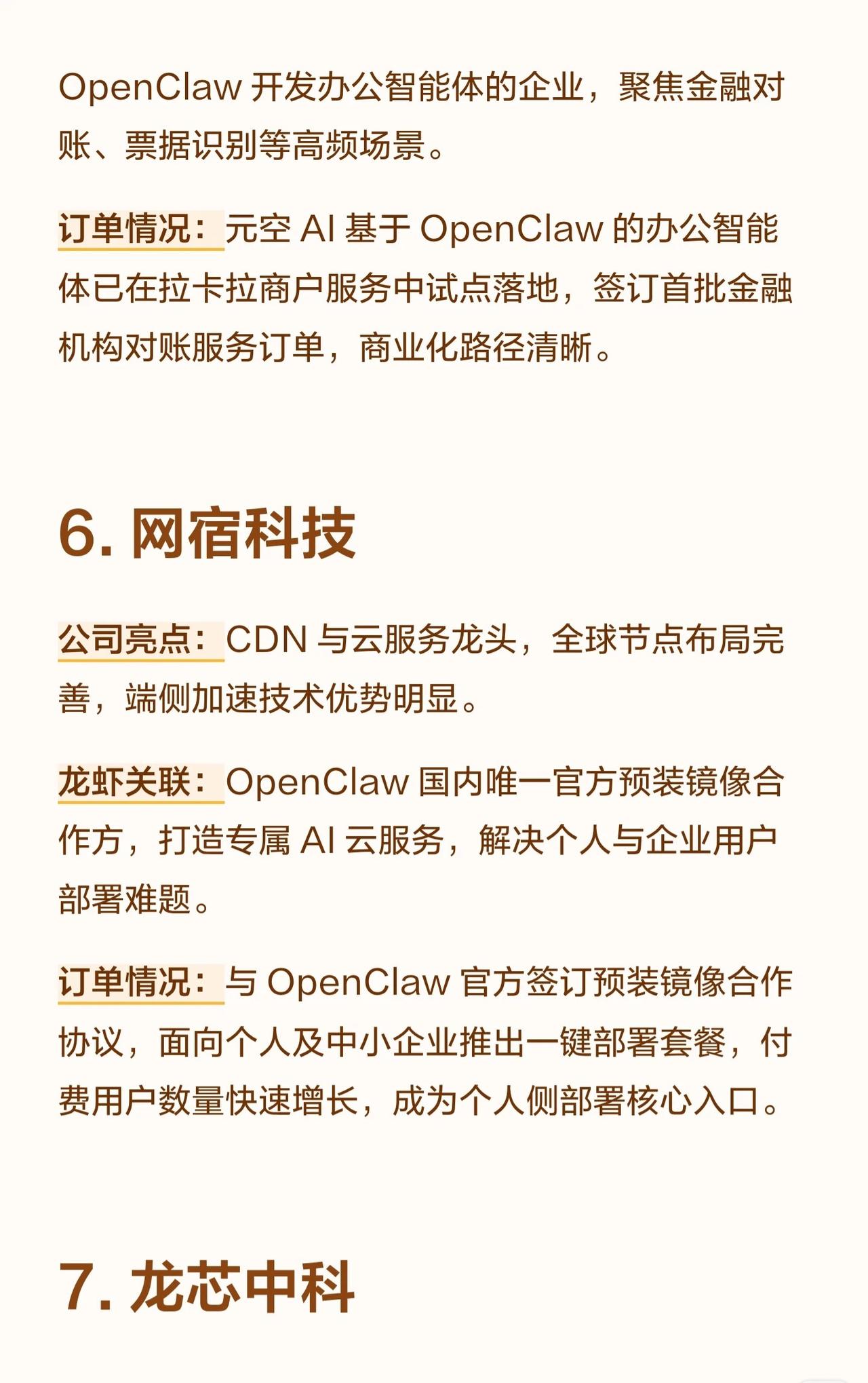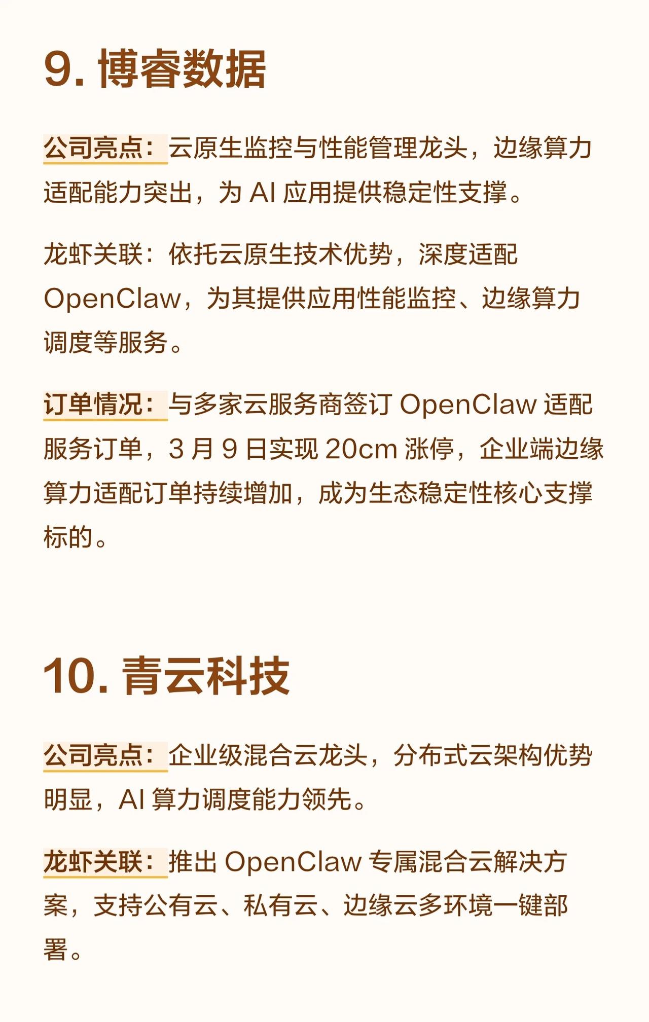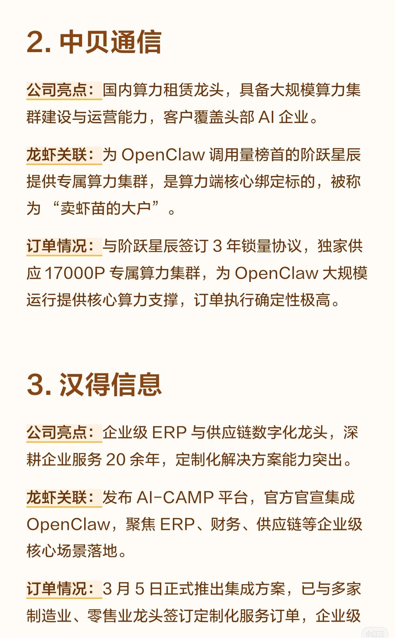 10家与“OpenClaw”项目相关的A股公司,将其称为“龙虾概念股”,并根据各自的业务特点,将它们分为不同角色并概述了其订单情况。 核心要点总结: 1. 共同背景: 所有公司都围绕一个名为 OpenClaw 的项目展开合作,该项目似乎是一个AI应用生态。 2. 产业链分工: * 算力提供方 (卖铲子/卖虾苗): 优刻得、中贝通信、云赛智联等公司提供云计算或算力集群服务。 * 平台/方案集成方 (卖铲子/核心支撑): 汉得信息、博睿数据、青云科技等将OpenClaw与ERP、监控、混合云等解决方案集成。 * 应用/终端方 (个人侧入口): 拉卡拉、网宿科技、金山办公等面向金融、商户或个人用户提供基于OpenClaw的应用服务。 * 硬件底座方 (国产替代): 龙芯中科提供基于自主CPU的本地部署方案。 3. 订单亮点: 多家公司都已与OpenClaw或相关企业(如阶跃星辰、元空AI)签订合作协议或订单,部分公司订单金额巨大、增长迅速,且覆盖海外节点或政企客户,显示出良好的商业化落地节奏和确定性。