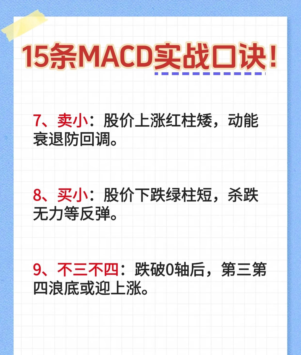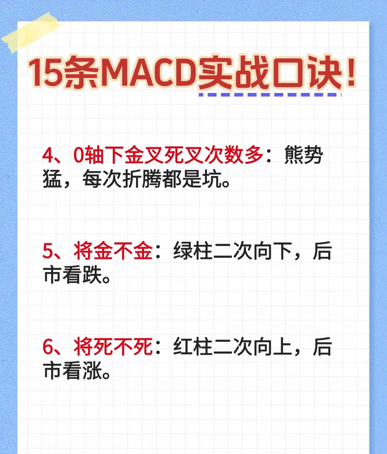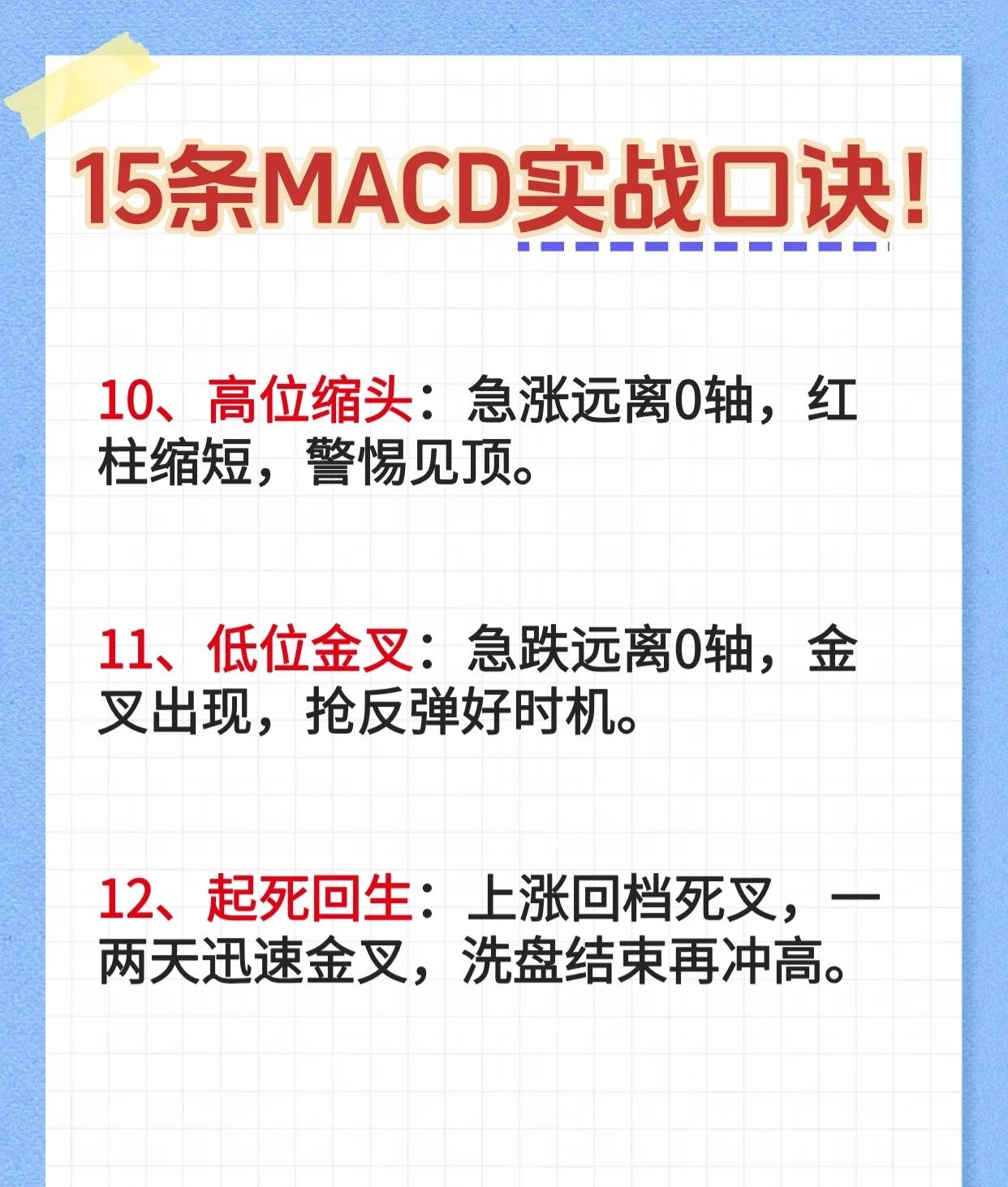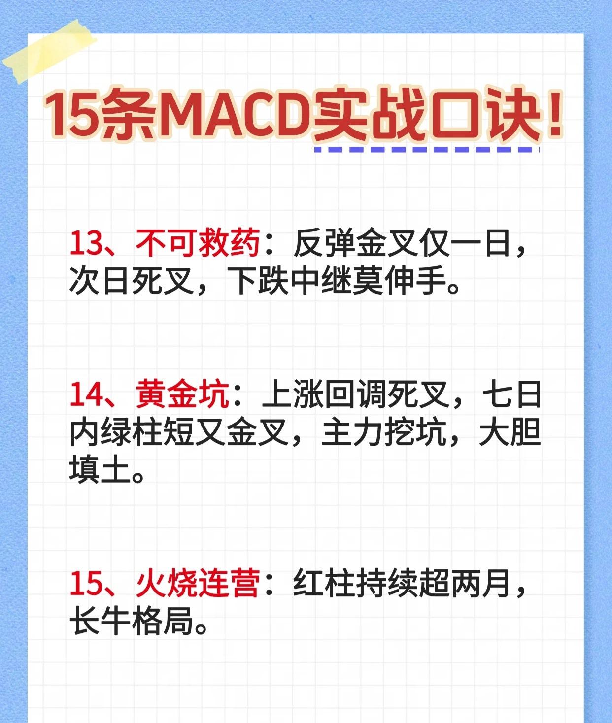 MACD实战口诀的核心总结,按逻辑分类提炼: 一、0轴上下(多空区域判断) 1. 0轴上方(多头区):金叉+股价新高→多头趋势,低吸高抛至顶背离。 2. 0轴下方(空头区):死叉+股价新低→金叉仅反弹,站上0轴才安全。 二、金叉死叉次数(趋势强度) 3. 0轴上次数多:牛气盛,洗盘后劲足。 4. 0轴下次数多:熊势猛,每次折腾是坑。 三、特殊交叉形态(动能延续/反转) 5. 将金不金:绿柱二次向下→后市看跌。 6. 将死不死:红柱二次向上→后市看涨。 四、柱形与动能(买卖信号) 7. 卖小:股价涨、红柱矮→动能衰退,防回调。 8. 买小:股价跌、绿柱短→杀跌无力,等反弹。 五、0轴跌破后的浪形(底部机会) 9. 不三不四:跌破0轴后,第三、四浪底或迎上涨。 六、高位/低位极端形态(转折信号) 10. 高位缩头:急涨离0轴、红柱缩短→警惕见顶。 11. 低位金叉:急跌离0轴、金叉出现→抢反弹时机。 七、回档洗盘(主力行为) 12. 起死回生:上涨回档死叉,1 - 2日迅速金叉→洗盘结束再冲高。 13. 黄金坑:上涨回调死叉,7日内绿柱短又金叉→主力挖坑,大胆参与。 八、弱势反弹/强势趋势(规避/坚守) 13. 不可救药:反弹金叉仅1日,次日死叉→下跌中继,勿伸手。 14. 火烧连营:红柱持续超2月→长牛格局,坚定持有。 口诀本质:通过MACD的0轴位置、交叉次数、柱形变化、极端形态,判断趋势强弱、买卖时机、主力意图,辅助实战决策。