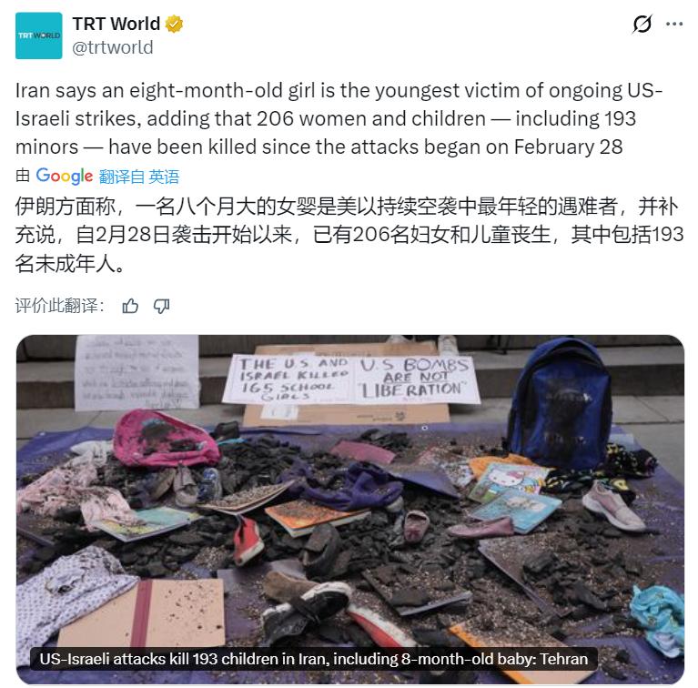 伊朗方面称,一名八个月大的女婴是美以持续空袭中最年轻的遇难者。自2月28日袭击开始以来,已有206名妇女和儿童丧生,其中包括193名未成年人。