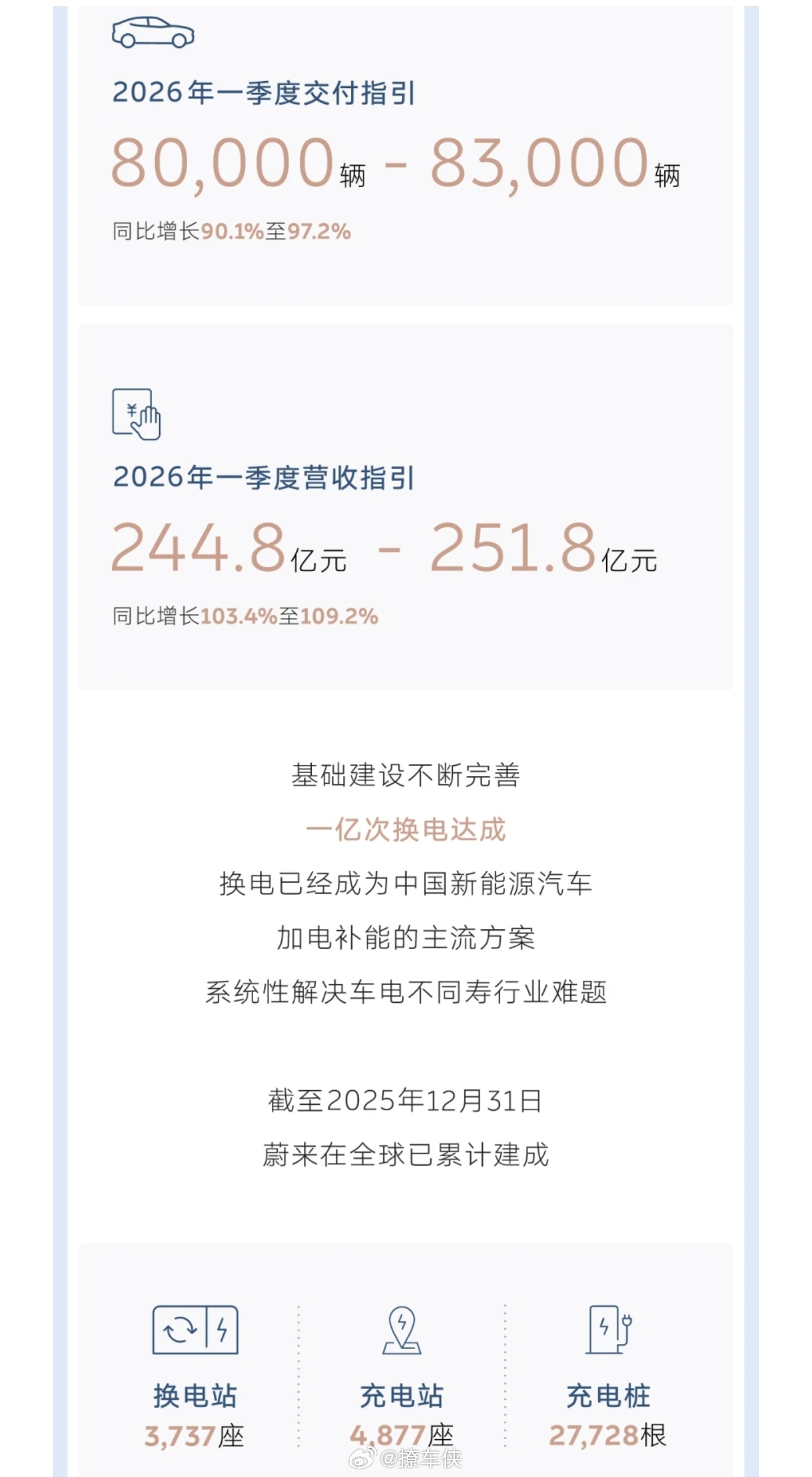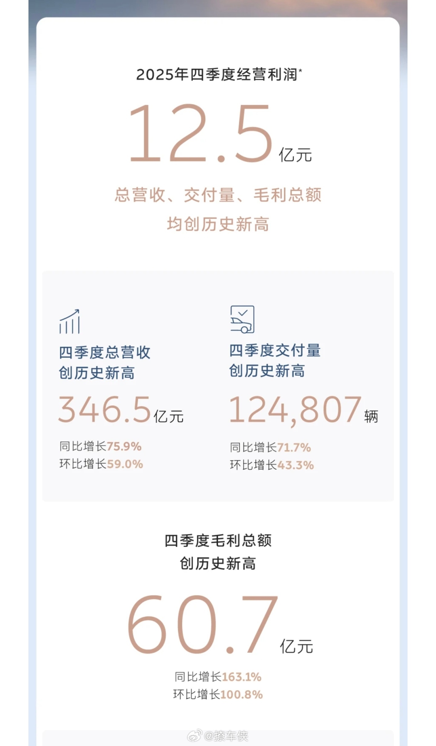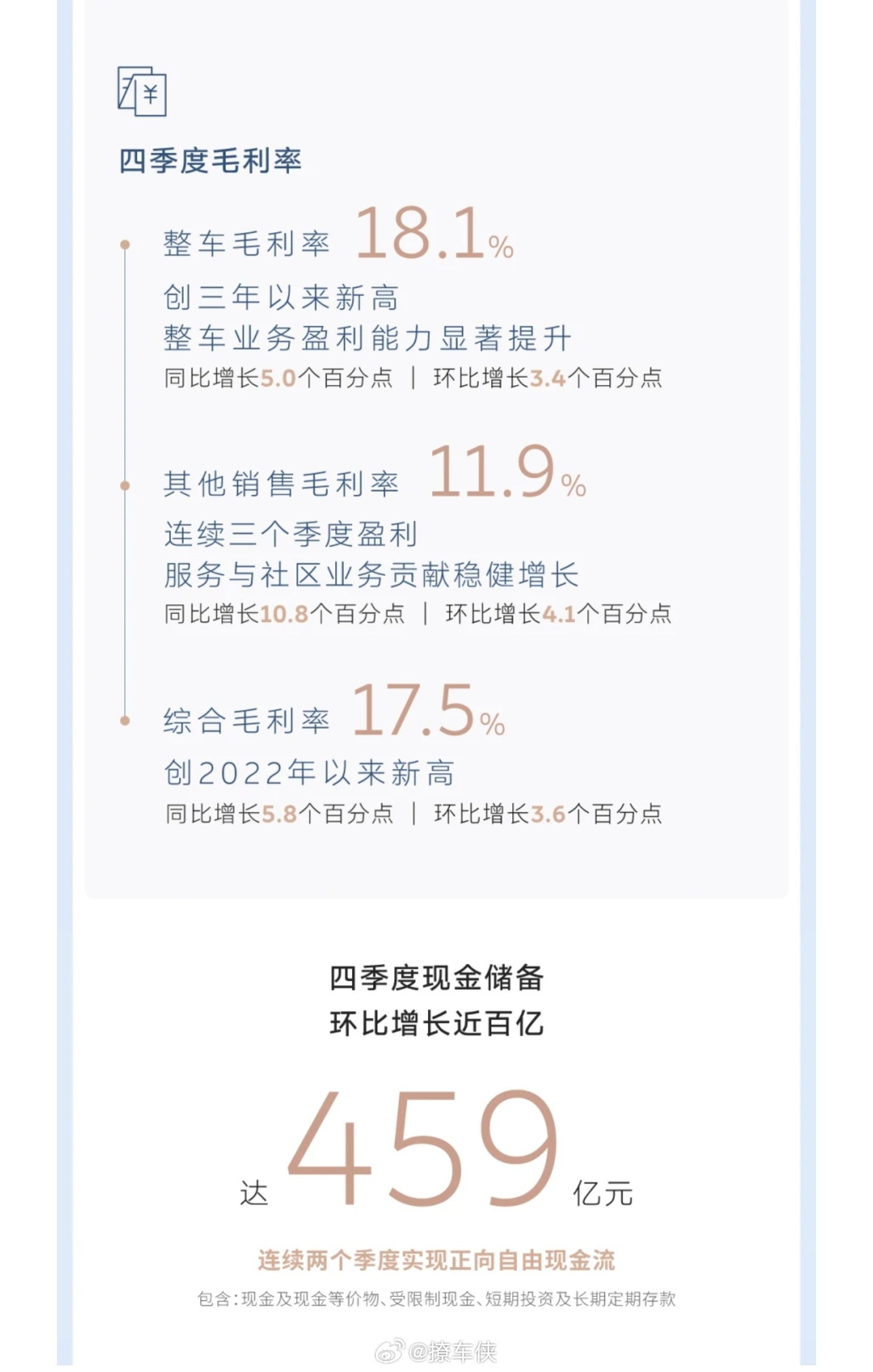 蔚来四季度盈利12.5亿元 蔚来这次财报真支棱起来了,作为蔚来的车主必须要说两句,四季度真的盈利了,赚了12.5个亿,这可是头一回啊兄弟们,账上现金直接飙到459亿,一下子多了近百亿,这下底气足了啊。全年卖了32.6万台,涨了快一半,营收874.9亿。最牛的是毛利率蹭蹭往上涨,整车毛利率回到18%以上,说明卖车越来越会赚钱了。更夸张的是今年一季度指引,预计交付8万到8.3万台,比去年同期翻倍,营收指引也翻倍,这增速也太猛了。李斌说公司进入第三阶段、开启新增长周期,看这数据确实不是在吹牛。希望蔚来越来越好,一起加电!大v聊车