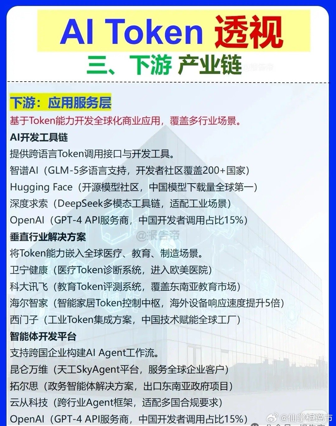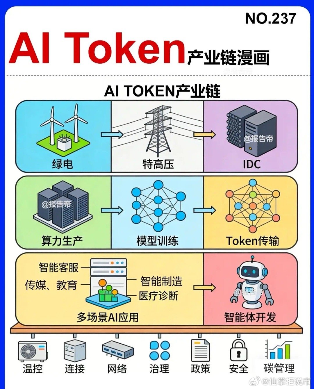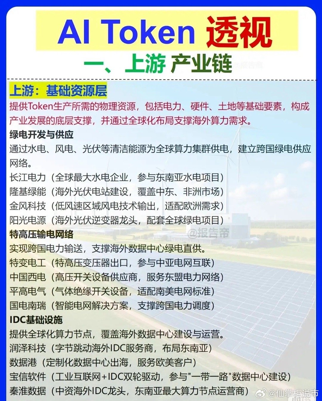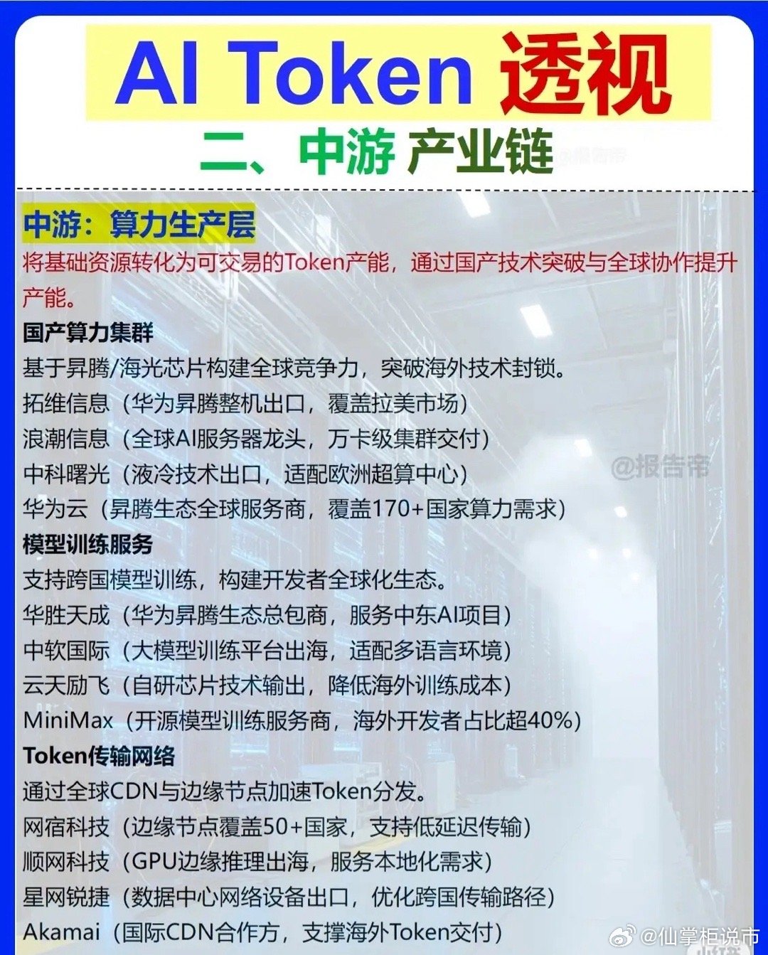 聚焦AI Token产业链,按“上游-中游-下游-配套支撑层”拆解: