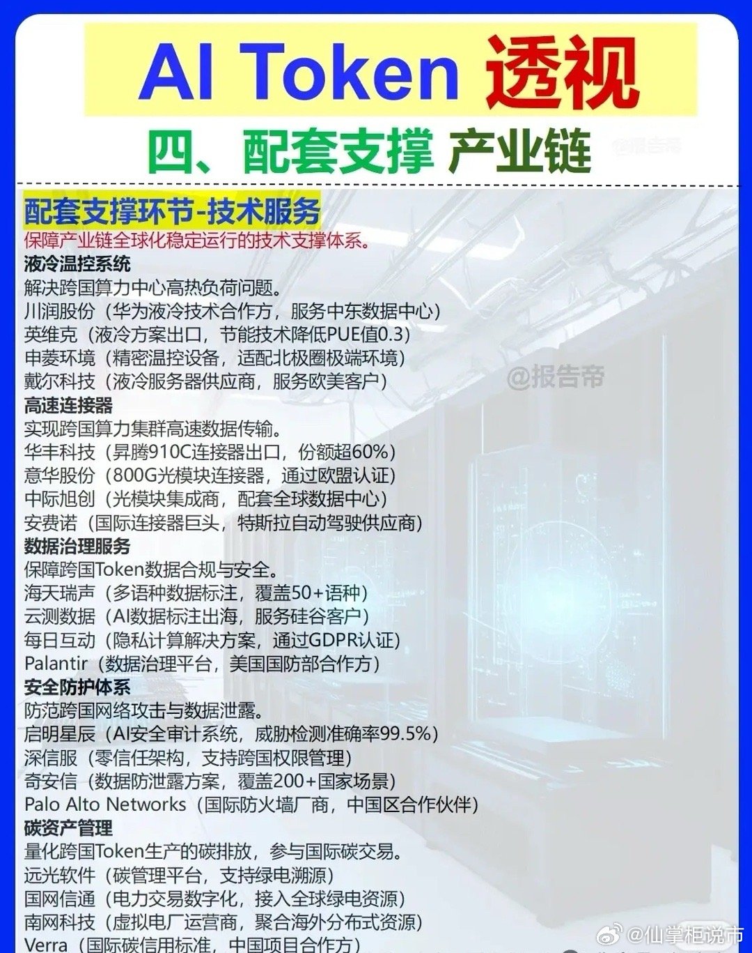 - 上游(基础资源层):绿电开发(长江电力等)、特高压输电(特变电工等)、IDC基础设施(润泽科技等),提供能源、电力、算力节点支撑;- 中游(算力生产层):国产算力集群(拓维信息等,基于昇腾/海光芯片)、模型训练服务(华胜天成等,支持跨国训练)、Token传输网络(网宿科技等,CDN+边缘节点加速分发);- 下游(应用服务层):AI开发工具链(智谱AI等,提供开发接口)、垂直行业方案(卫宁健康等,嵌入医疗/教育等场景)、智能体开发平台(昆仑万维等,构建AI Agent工作流);- 配套支撑层:液冷温控(川润股份等)、高速连接器(华丰科技等)、数据治理(海天瑞声等)、安全防护(启明星辰等)、碳资产管理(远光软件等),保障产业链合规、安全、低碳运转。
