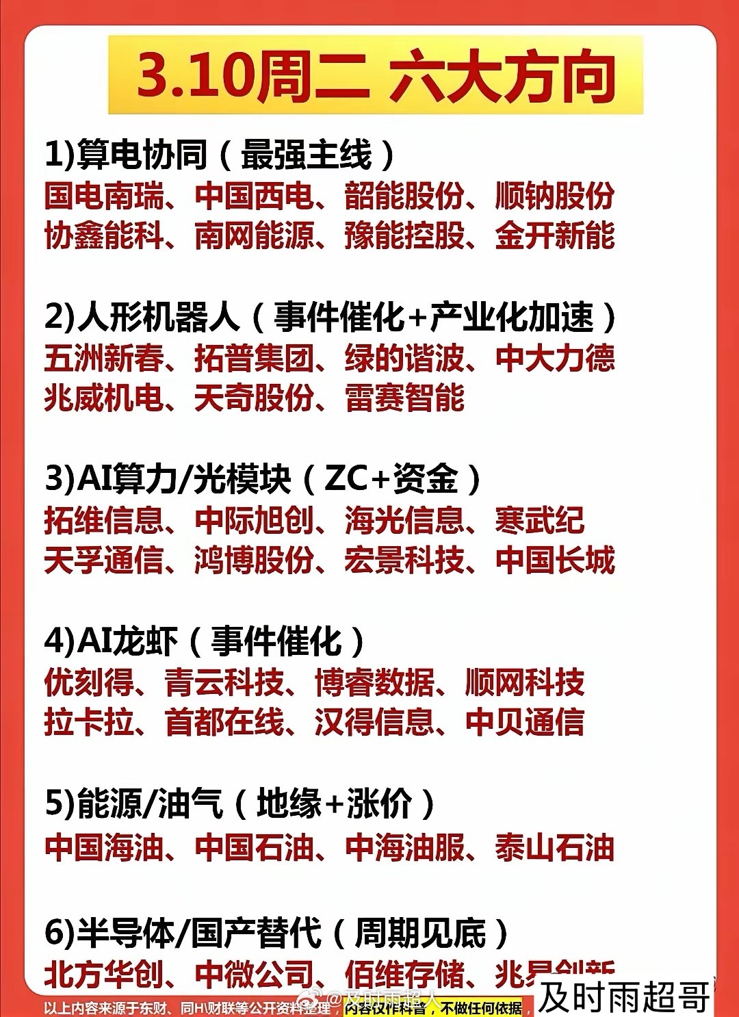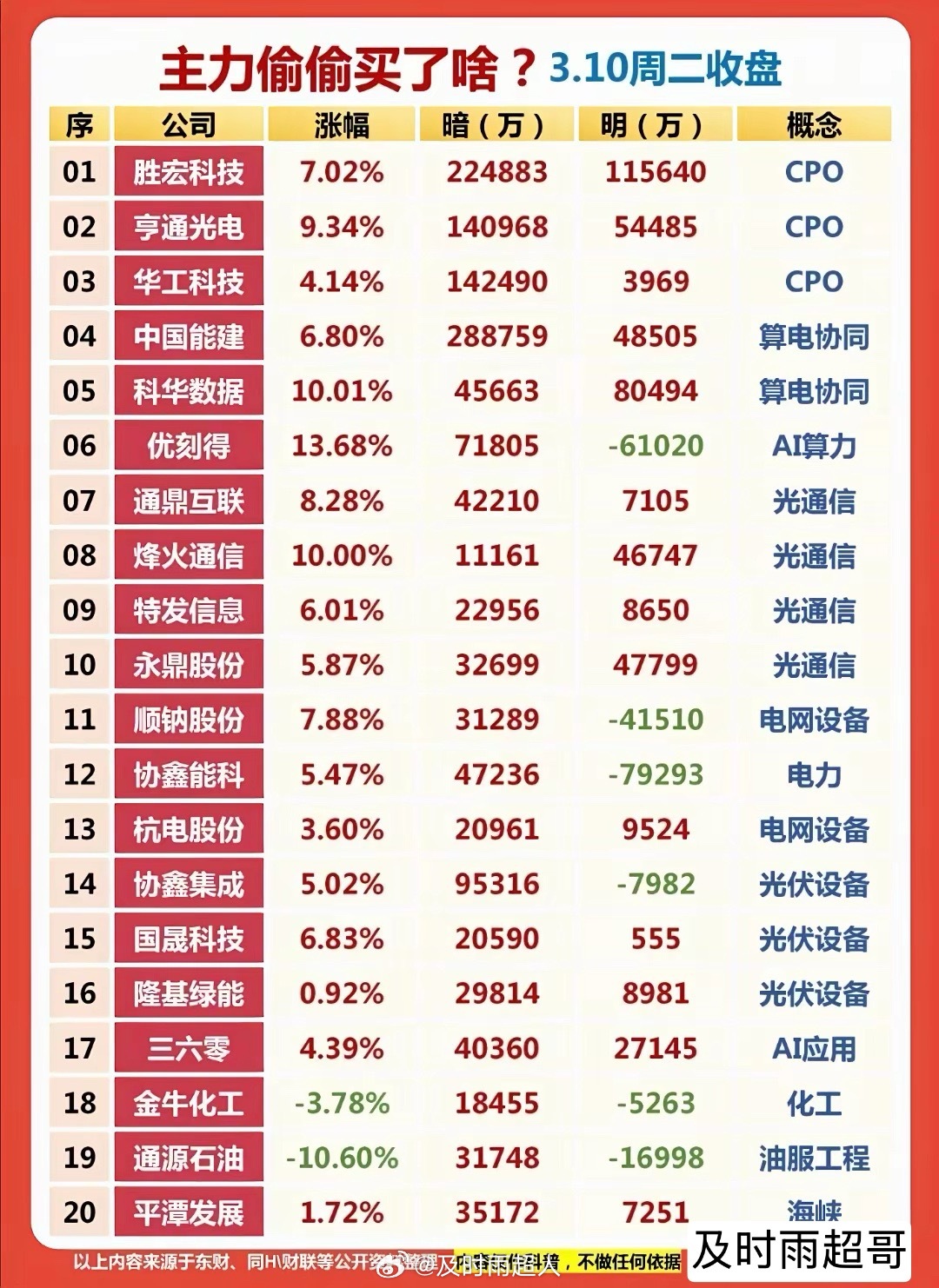 3月10日周二复盘整理:主力资金动向+尾盘抢筹名单+暗盘资金数据等等。(1)资金动向TOP20出炉!天孚通信、胜宏科技、立讯精密领衔净流入榜,算力、光通信赛道获资金热捧;特变电工、拓维信息、金开新能则位列净流出前列,高低切迹象明显。(2)尾盘抢筹动向:天孚通信、立讯精密狂揽超10亿净流入,算力、通信设备板块尾盘获资金集中抢筹;拓维信息、特变电工则遭超15亿资金出逃,高位股尾盘承压明显。(3) 主力偷偷买了这些!大资金暗盘流入CPO概念成绝对主力!胜宏科技、亨通光电暗盘资金超140亿,主力疯狂锁筹;光通信、算电协同板块获重金追捧,光模块赛道成近期最强风口;⚠️ 以上仅为数据参考,不构成投资,资料全网公开,不对任何人构成投资建议。