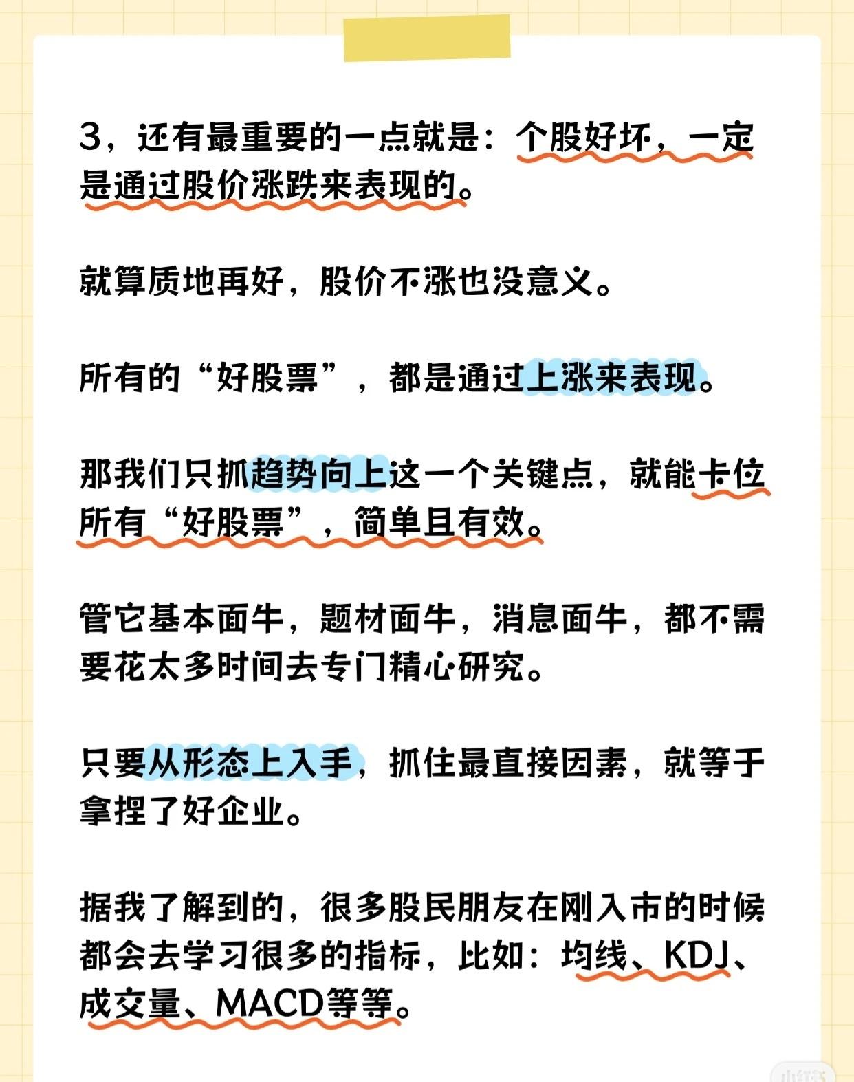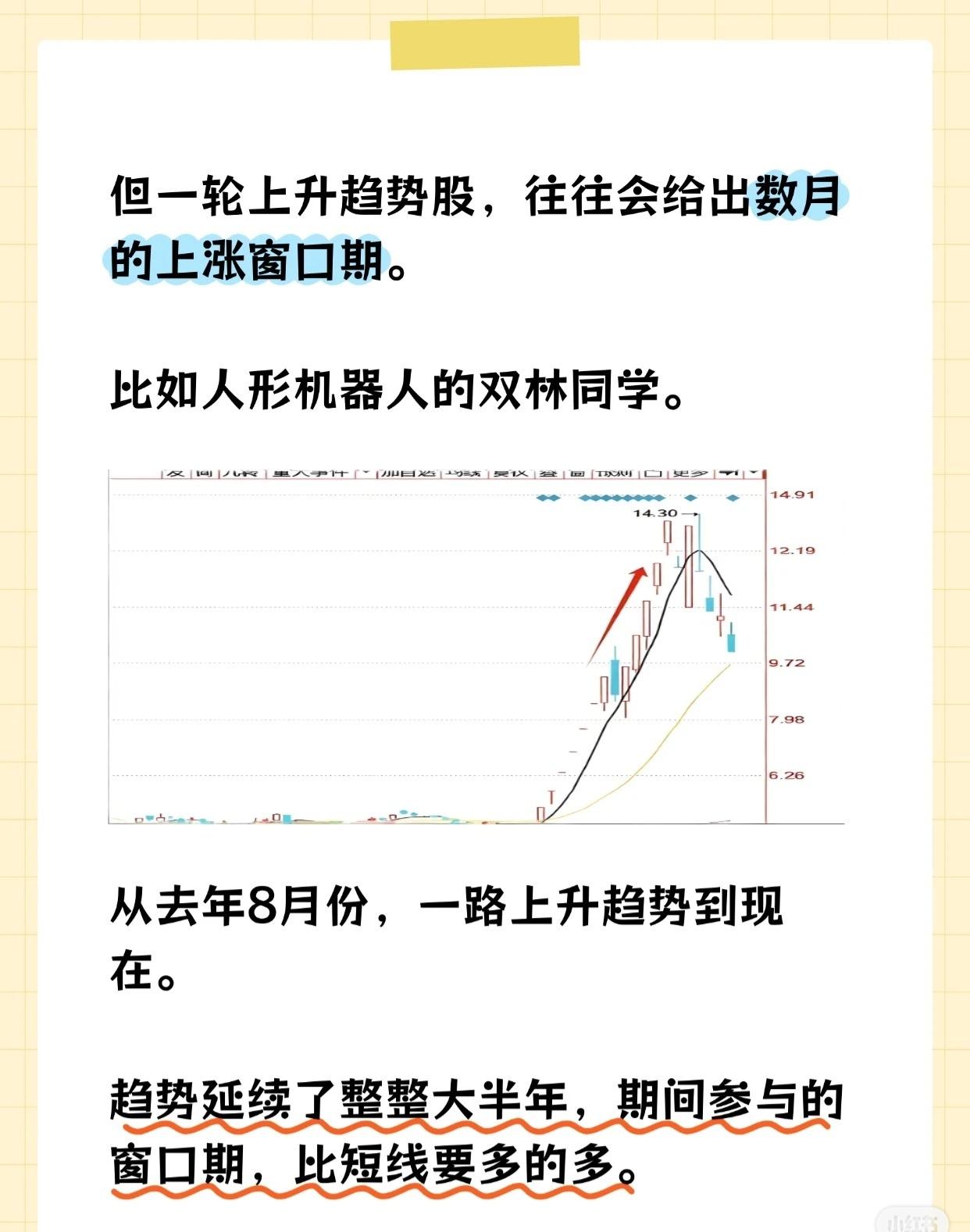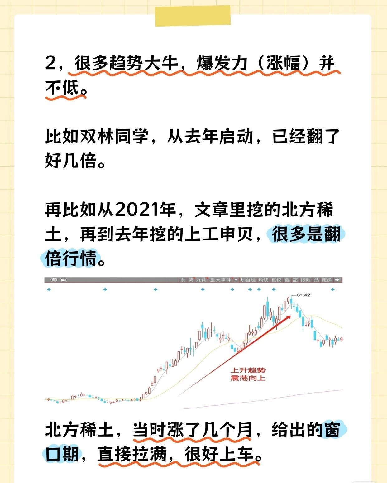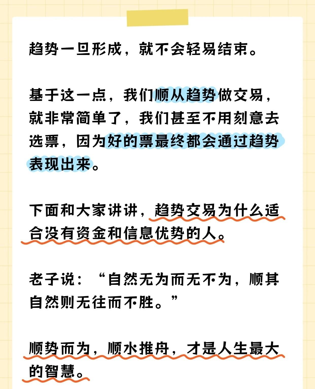 该内容围绕中国股市中“坚持趋势交易”的炒股方法展开,核心要点如下: 1. 趋势交易的核心逻辑:趋势一旦形成不易结束,顺势交易简单有效——好股票会通过趋势“自我表现”,无需刻意选票。 2. 适合人群(无资金/信息优势的散户)的原因: - 时间与空间友好:短线龙头(如“芳芳”)周期短(7天见顶),但上升趋势股(如“双林同学”)有数月上涨窗口,上班族可灵活参与。 - 爆发力不低:趋势大牛涨幅可观(如“双林”翻几倍、“北方稀土”“上工申贝”翻倍)。 - 聚焦关键信号:个股好坏通过股价涨跌体现,只需抓“趋势向上”形态,无需深入研究基本面/题材面(避免信息壁垒)。 3. 作者经验佐证:初入股市因信息、成本劣势难做价投,转型趋势交易后盈利(提款千万),验证趋势交易对普通散户的可行性。 简言之,趋势交易“顺自然、轻研究、高适配”,是普通散户在股市“长久发财”的有效路径。