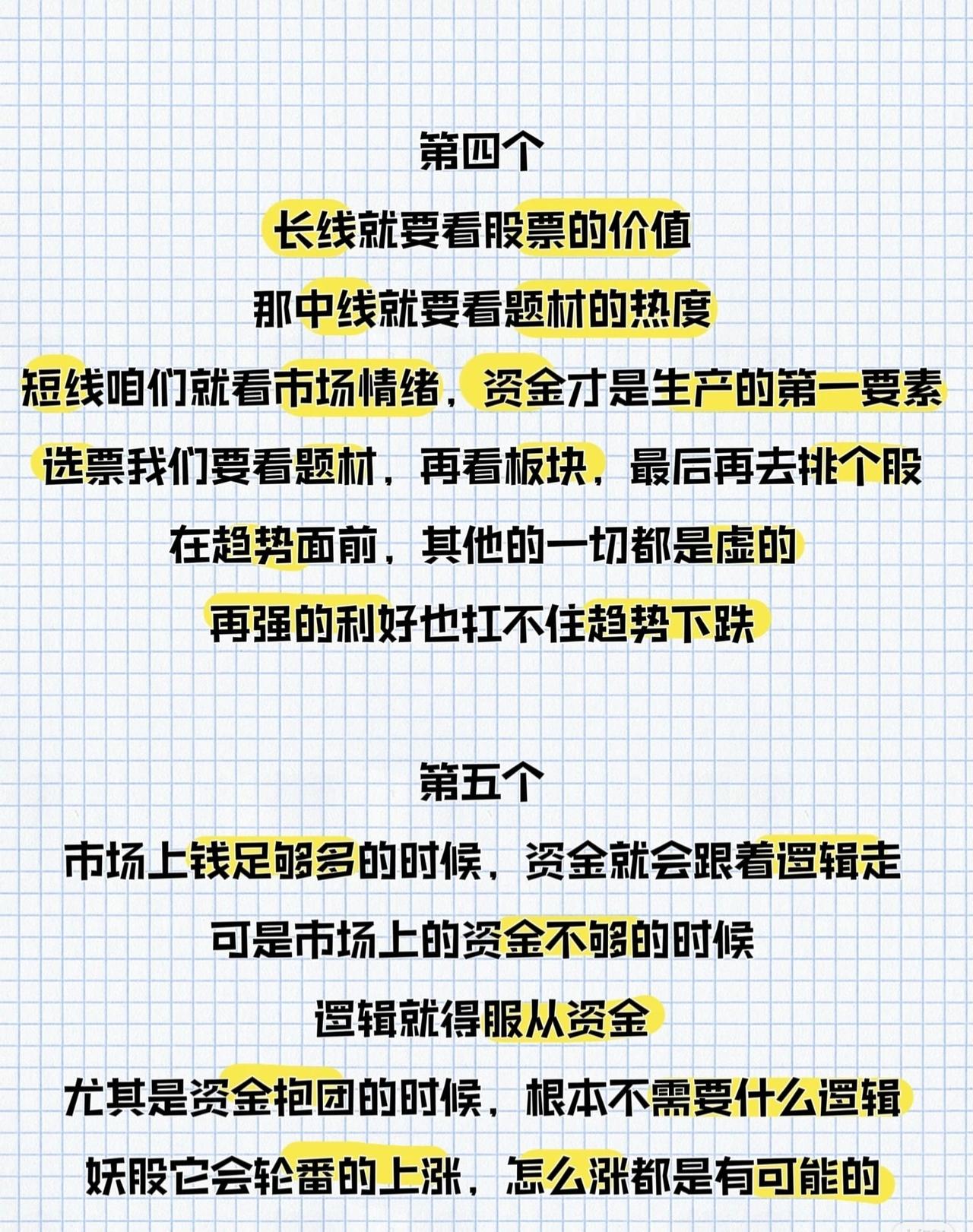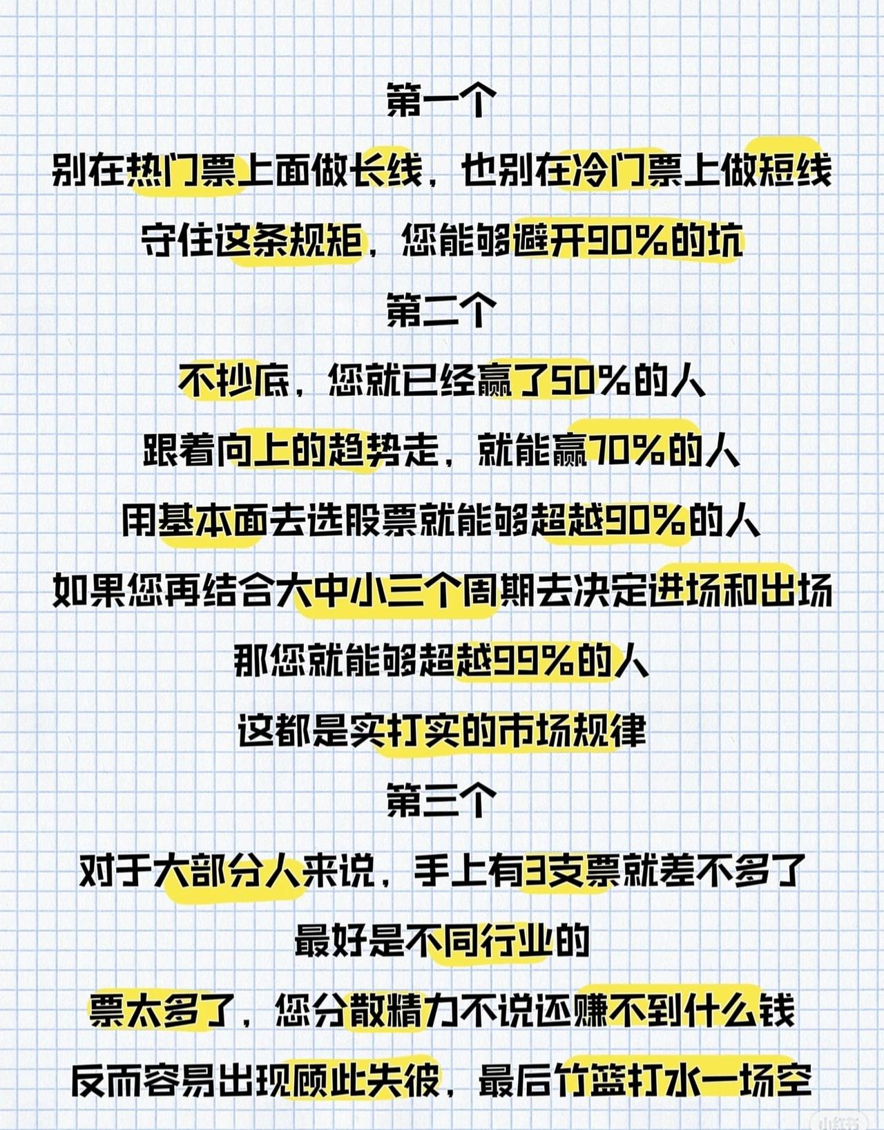 “炒股不难,悟透7句话即可”,7句话的关键要点如下: 1. 选股周期:热门股不做长线,冷门票不做短线,守此规矩避90%坑; 2. 操作策略:不抄底赢50%人,跟趋势赢70%,基本面选股超90%,结合大中小周期超99%; 3. 持股数量:多数人持3支不同行业票足够,多了分散精力难盈利; 4. 操作逻辑:长线看价值、中线看题材热度、短线看情绪(资金是核心);选股先题材、再板块、后个股,趋势面前利好也扛不住下跌; 5. 资金与逻辑:钱够时资金跟逻辑走,钱不够时逻辑服从资金,资金抱团时妖股轮涨无定式; 6. 价格与判断:股价由内部获利筹码占比决定,涨跌别瞎猜顶底,追涨杀跌辩证看,要有独立判断; 7. 盈利核心:买卖靠交易模式,盈利靠心态+仓位控制——模式对、心态稳、仓位控,钱自然来。 整体围绕“选股周期、操作策略、持股数量、长短线逻辑、资金与逻辑、价格判断、盈利要素”7个维度,用通俗规律总结炒股关键。