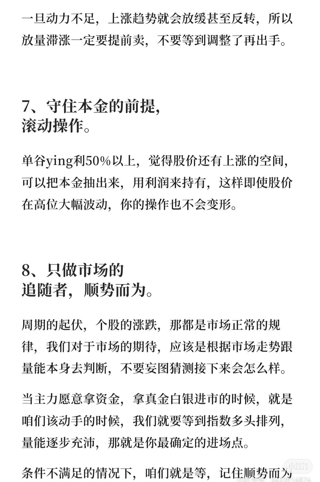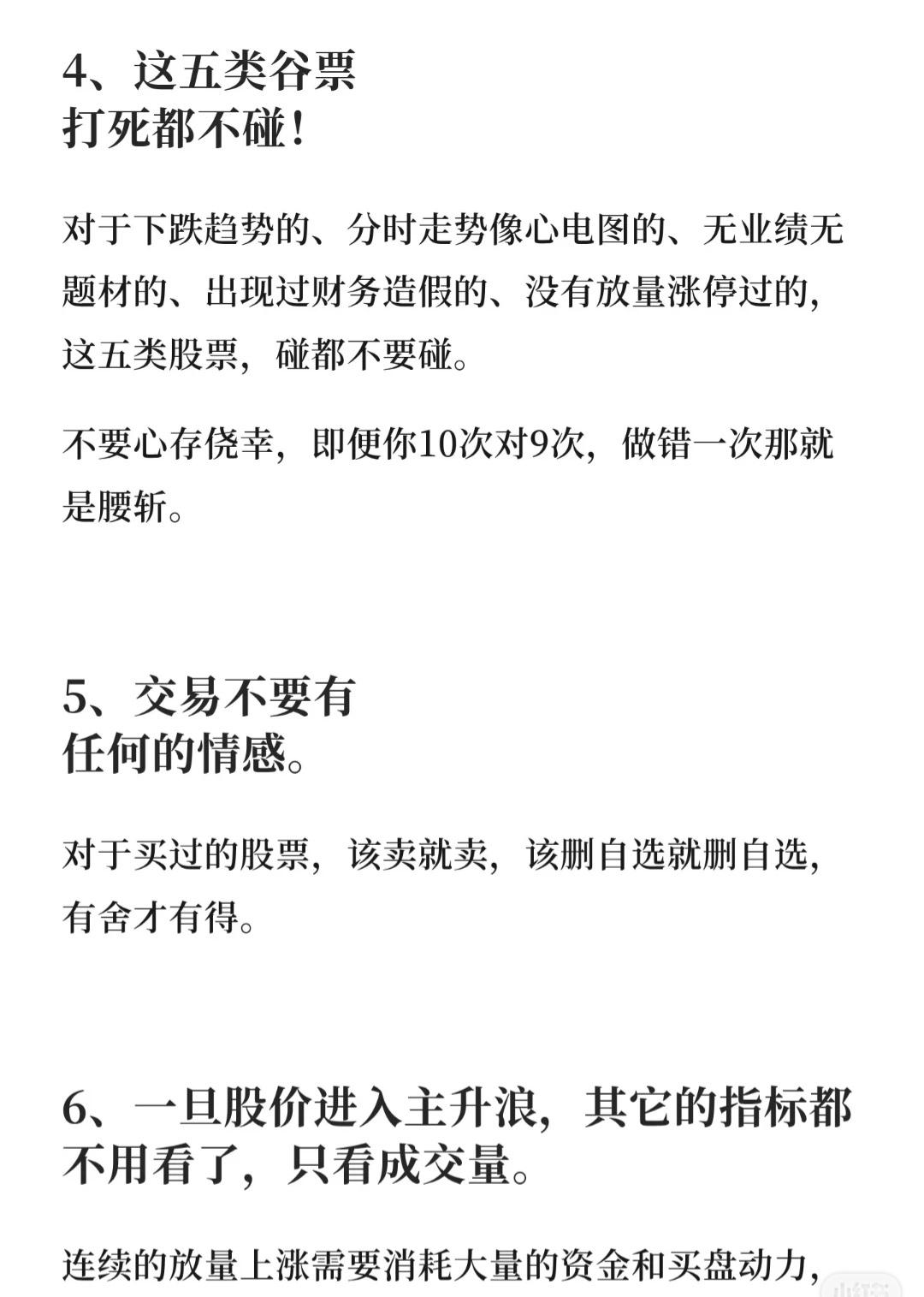 核心主题:短线交易八大铁律 1. 追高不抄底:做短线要敢于追龙头股,而不是在下跌趋势中试图抄底。 2. 远离五类股:坚决避开下跌趋势、无量震荡、无业绩题材、财务造假、从未放量涨停的股票。 3. 无情交易:买卖决策要果断,不带感情,该卖就卖,不侥幸。 4. 主升浪看量能:股价进入主升浪后,只需关注成交量,放量滞涨是离场信号。 5. 滚动操作保本金:盈利50%以上可抽出本金,用利润继续持有,降低高位波动风险。 6. 顺势而为:只做市场的追随者,等待指数多头排列、量能充沛时再进场。 一句话概括: 通过追龙头、避烂股、重量能、无感情、保本金、顺大势的策略,进行高效的短线交易。