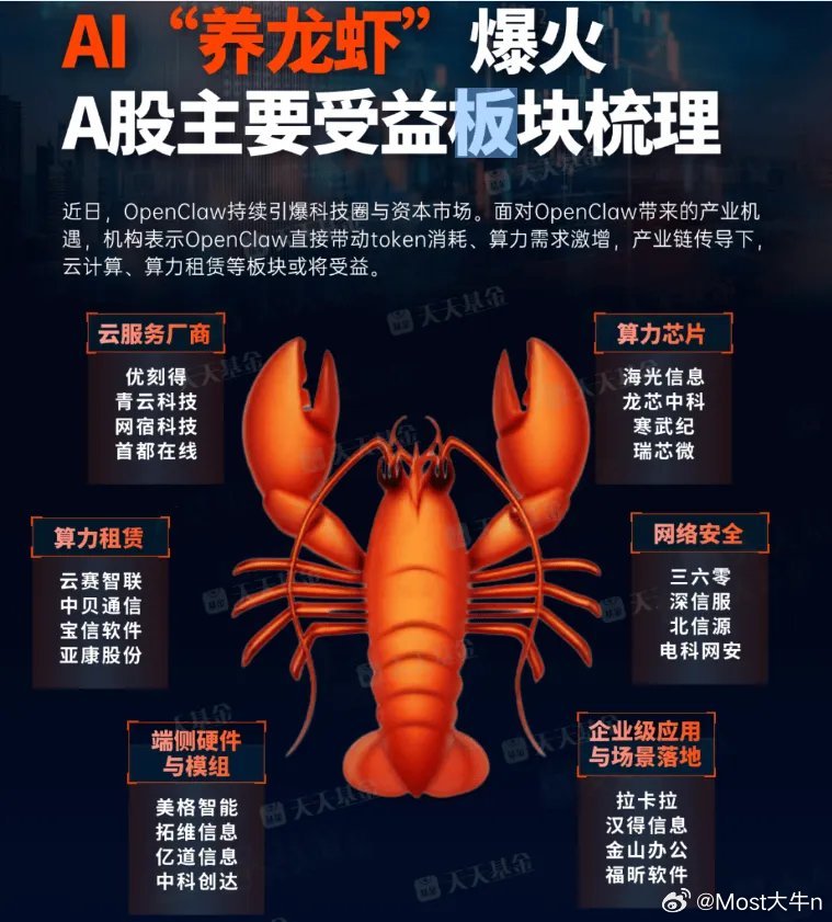 这两天“养龙虾”彻底火了,在A股港股也爆炒。大A主要是国产算力硬件,算力租赁、AI服务器、存储、CPU芯片、云计算、电网设备等全线上涨!港股今天腾讯、阿里、minimax、智谱等龙虾概念股集体暴涨!minimax上市2个半月股价涨了6.5倍,最新市值高达3800亿,超过百度和京东,这也太疯狂了。这一波的小龙虾狂热实在有点热过头了,堪比去年的deepseek。不过,目前小龙虾有两个最大的问题,第一个是花费不少,需要消耗Token;二是使用还是有一定门槛的,不是谁都玩的转。总之,养龙虾之所以很火,一方面大家比较新奇,想尝鲜一下;一方面是大家都比较焦虑,生怕被AI给淘汰,也想龙虾帮我们做一些简单的工作!但养龙虾也存在安全风险,比如泄露你的隐私,误删你的文件,甚至信用卡被盗刷的等等!从A股的角度,它承载了AI应用落地的期待,巨头+地方政府都在强力支持,炒上一波大的是可能的。短期最正宗还是云计算、算力这些方向,依然是“卖铲子”的优先,然后是AI安全、AI+行业等方向!但这个到底能不能普及,其实还不大好说!因为还需要对于龙虾能力的不断发掘,不过A股先炒了再说,要信就先信,要么就不信。