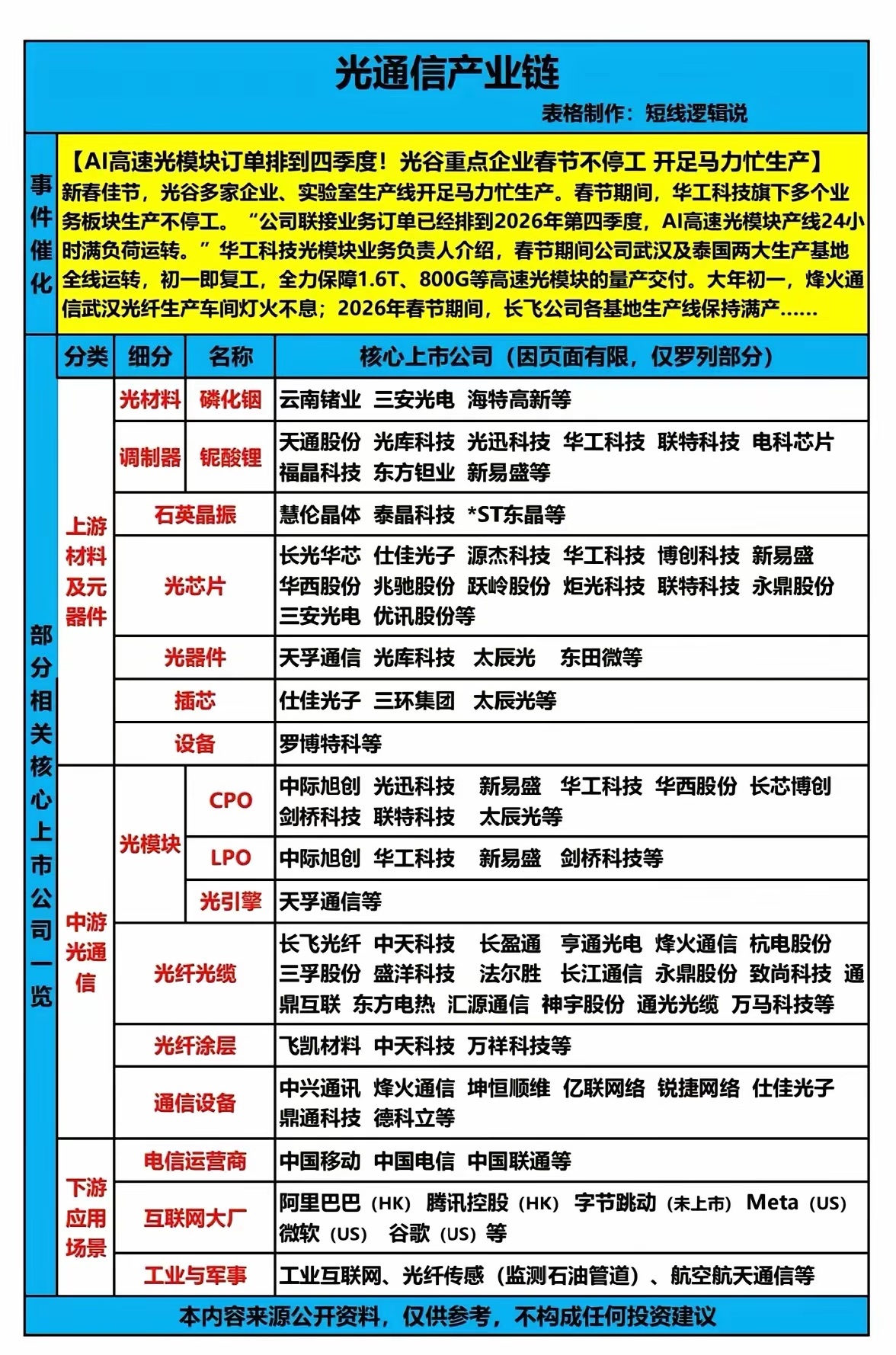 2026年,光纤光缆与光通信板块站上行业风口,作为数字经济、AI算力的底层基础设施,正迎来供需格局、行业景气度双重改善,具备清晰的中长期配置价值。一、行业核心定位光通信是数据传输的核心载体,覆盖5G建设、算力网络、数据中心、东数西算等关键领域,是数字时代不可或缺的“信息高速公路”,行业需求具备强刚需属性。二、核心投资价值行业走出此前价格战低谷,迎来量价齐升的景气周期。全球光纤供需缺口持续扩大,价格稳步回升,龙头企业盈利水平显著修复。同时,AI算力建设带动高速、低损耗等高端光纤需求激增,行业增长动能充足。三、核心投资逻辑需求端三重驱动:AI算力建设、东数西算工程落地、5G深度覆盖与6G技术前瞻布局,共同拉动光纤光缆需求持续增长,高端产品增速尤为突出。供给端壁垒清晰:上游光棒扩产周期长、产能刚性强,行业集中度持续提升,头部企业凭借技术与产能优势,占据市场主导地位。技术与业绩双升:高端光纤国产替代加速,产品结构持续优化;叠加行业价格回暖,企业毛利率与业绩确定性稳步抬升。