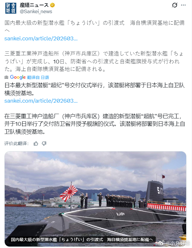 据日本右翼媒体称,日本最大新型潜艇“超纪”号交付仪式举行,该潜艇将部署于日本海上自卫队横须贺基地。而昨日,日本防卫省宣布,将于3月31日在国内首次部署国产远程导弹。海外新鲜事黄媒不会说的真相